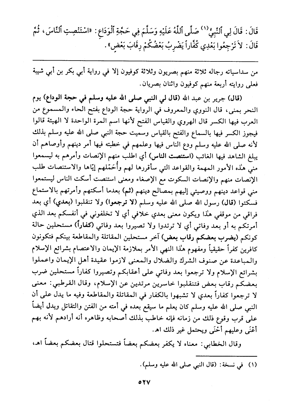 قَال: قَال لِي النَّبِيُّ (١) صلى الله عَلَيهِ وَسلمَ في حَجَّةِ الْوَدَاعِ: "اسْتَنْصِتِ النَّاسَ، ثُمَّ قَال: لا تَرْجِعُوا بَعْدِي كُفَّارًا يَضْرِبُ بَعْضُكُمْ رِقَابَ بَعْض"