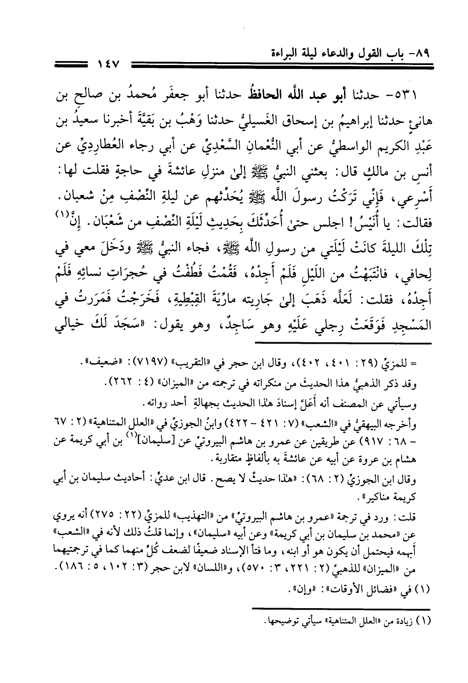 531 - حَدَّثَنَا أَبُو عَبْدِ اللَّهِ الحافظ، قَالَ: حَدَّثَنَا أَبُو جَعْفَرٍ مُحَمَّدُ بْنُ صَالِحِ بْنِ هَانِئٍ قَالَ: حَدَّثَنَا إِبْرَاهِيمُ بْنُ إِسْحَاقَ الغسيلي حَدَّثَنَا وَهْبُ بْنُ بَقِيَّةَ، أَخْبَرنَا سَعْدُ بْنُ عَبْدِ الْكَرِيمِ الْوَاسِطِيُّ، عَنْ أَبِي النُّعْمَانِ السَّعْدِيِّ، عَنْ أَبِي الرَّجَاءِ الْعُطَارِدِيِّ، عَنْ أَنَسِ بْنِ مَالِكٍ رضي الله عنه، قَالَ: بَعَثَنِي النَّبِيُّ صَلَّى اللهُ عَلَيْهِ وَسَلَّمَ إِلَى مَنْزِلِ عَائِشَةَ رَضِيَ اللَّهُ عَنْهَا فِي حَاجَةٍ، فَقُلْتُ لَهَا: أَسْرِعِي فَإِنِّي تَرَكْتُ رَسُولَ اللَّهِ صَلَّى اللهُ عَلَيْهِ وَسَلَّمَ يُحَدِّثُهُمْ عَنْ لَيْلَةِ النِّصْفِ مِنْ شَعْبَانَ، فَقَالَتْ: يَا أُنَيْسُ اجْلِسْ حَتَّى أُحَدِّثَكَ بِحَدِيثِ لَيْلَةِ النِّصْفِ مِنْ شَعْبَانَ، إِنَّ تِلْكَ اللَّيْلَةَ كَانَتْ لَيْلَتِي مِنْ رَسُولِ اللَّهِ صَلَّى اللهُ عَلَيْهِ وَسَلَّمَ فَجَاءَ النَّبِيُّ صَلَّى اللهُ عَلَيْهِ وَسَلَّمَ وَدَخَلَ مَعِي فِي لِحَافِي، فَانْتَبَهْتُ مِنَ اللَّيْلِ فَلَمْ أَجِدْهُ، فَقُمْتُ فَطُفْتُ فِي حُجُرَاتِ نِسَائِهِ فَلَمْ أَجِدْهُ فَقُلْتُ لَعَلَّهُ ذَهَبَ إِلَى جَارِيَتِهِ مَارِيَةَ الْقِبْطِيَّةِ فَخَرَجْتُ فَمَرَرْتُ فِي الْمَسْجِدِ فَوَقَعَتْ رِجْلِي عَلَيْهِ وَهُوَ سَاجِدٌ