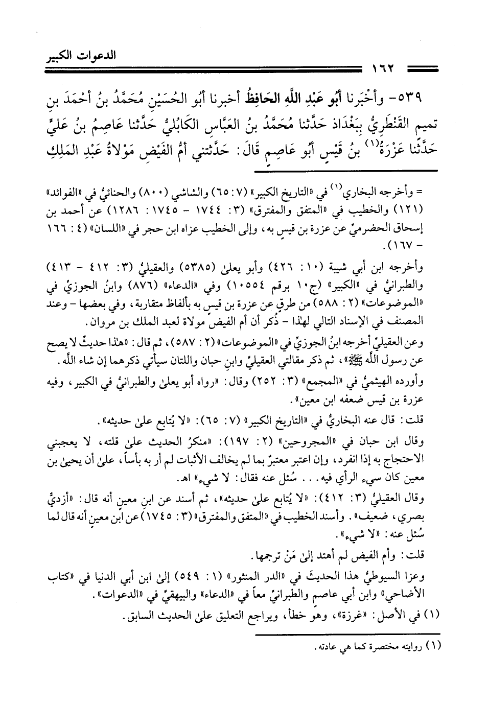 538 - أَنْبَأَنَا مُحَمَّدُ بْنُ عَبْدِ اللَّهِ الْحَافِظُ، أَخْبَرَنَا أَبُو جَعْفَرٍ أَحْمَدُ بْنُ عُبَيْدٍ الْحَافِظُ , وَعَبْدَانُ بْنُ يَزِيدَ الدَّقَّاقُ بِهَمَذَانَ قَالَا: حَدَّثَنَا إِبْرَاهِيمُ بْنُ الْحُسَيْنِ بْنِ دِيزِيلَ، حَدَّثَنَا مُسْلِمُ بْنُ إِبْرَاهِيمَ، حَدَّثَنَا عَزْرَةُ بْنُ قَيْسٍ الْيَحْمَدِيُّ، فِي مَجْلِسِ حَمَّادِ بْنِ سَلَمَةَ، وَحَمَّادٌ يَسْمَعُ قَالَ: حَدَّثَتْنِي أُمُّ الْفَيْضِ، مَوْلَاةُ عَبْدِ اللَّهِ بْنِ مَسْعُودٍ قَالَتْ: سَمِعْتُ عَبْدَ اللَّهِ بْنَ مَسْعُودٍ، يَقُولُ: §" مَا مِنْ عَبْدٍ وَلَا أَمَةٍ دَعَا اللَّهَ لَيْلَةَ عَرَفَةَ بِهَذِهِ الدَّعَوَاتِ، وَهِيَ عَشْرُ كَلِمَاتٍ أَلْفَ مَرَّةٍ إِلَّا لَمْ يَسْأَلِ اللَّهَ شَيْئًا إِلَّا أَعْطَاهُ إِيَّاهُ , إِلَّا قَطِيعَةَ رَحِمٍ أَوْ مَأْثَمًا: سُبْحَانَ الَّذِي فِي السَّمَاءِ عَرْشُهُ، سُبْحَانَ الَّذِي فِي الْأَرْضِ مَوْطِئُهُ، سُبْحَانَ الَّذِي فِي الْبَحْرِ سَبِيلُهُ، سُبْحَانَ الَّذِي فِي النَّارِ سُلْطَانُهُ، سُبْحَانَ الَّذِي فِي الْجَنَّةِ رَحْمَتُهُ، سُبْحَانَ الَّذِي فِي الْقُبُورِ قَضَاؤُهُ، سُبْحَانَ الَّذِي فِي الْهَوَاءِ رَوْحُهُ، سُبْحَانَ الَّذِي رَفَعَ السَّمَاءَ، سُبْحَانَ الَّذِي وَضَعَ الْأَرْضَ، سُبْحَانَ الَّذِي لَا مَلْجَأَ وَلَا مَنْجَى مِنْهُ إِلَّا إِلَيْهِ " قَالَتْ أُمُّ الْفَيْضِ: فَقُلْتُ لِعَبْدِ اللَّهِ بْنِ مَسْعُودٍ: أَنْتَ سَمِعْتَ هَذَا مِنْ رَسُولِ اللَّهِ صَلَّى اللهُ عَلَيْهِ وَسَلَّمَ؟ قَالَ: نَعَمْ