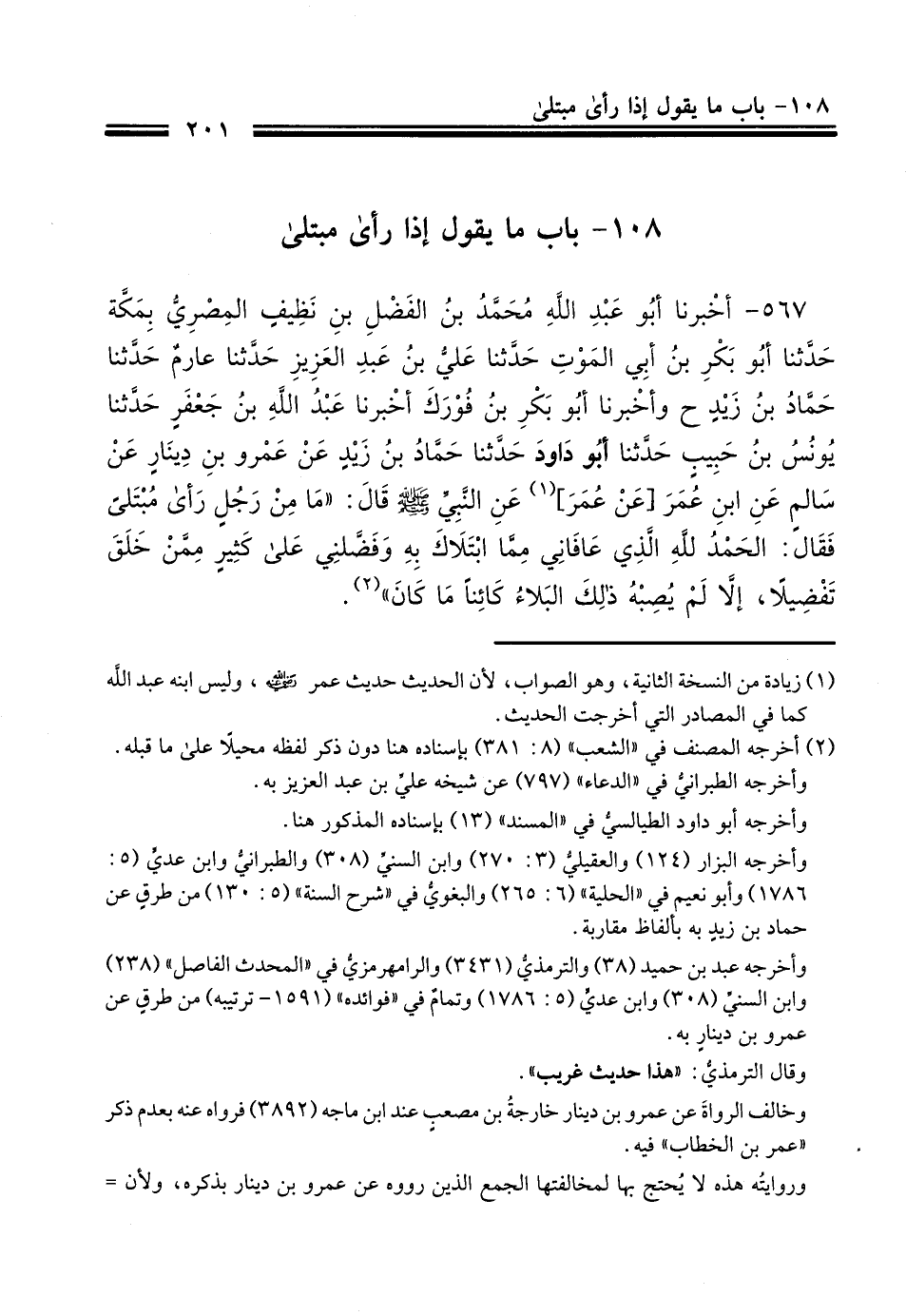 567 - أَخْبَرَنَا أَبُو عَبْدِ اللَّهِ مُحَمَّدُ بْنُ الْفَضْلِ بْنِ نَظِيفٍ الْمِصْرِيُّ بِمَكَّةَ، حَدَّثَنَا أَبُو بَكْرِ بْنُ أَبِي الْمَوْتِ، حَدَّثَنَا عَلِيُّ بْنُ عَبْدِ الْعَزِيزِ، حَدَّثَنَا عَارِمٌ، حَدَّثَنَا حَمَّادُ بْنُ زَيْدٍ، ح وَأَخْبَرَنَا أَبُو بَكْرِ بْنُ فُورَكٍ، أَخْبَرَنَا عَبْدُ اللَّهِ بْنُ جَعْفَرٍ، حَدَّثَنَا يُونُسُ بْنُ حَبِيبٍ، أَخْبَرَنَا أَبُو دَاوُدَ، حَدَّثَنَا حَمَّادُ بْنُ زَيْدٍ، عَنْ عَمْرِو بْنِ دِينَارٍ، عَنْ سَالِمٍ، عَنِ ابْنِ عُمَرَ، عَنْ عُمَرَ، عَنِ النَّبِيِّ صَلَّى اللهُ عَلَيْهِ وَسَلَّمَ قَالَ: " §مَا مِنْ رَجُلٍ رَأَى مُبْتَلًى فَقَالَ: الْحَمْدُ لِلَّهِ الَّذِي عَافَانِي مِمَّا ابْتَلَاكَ بِهِ، وَفَضَّلَنِي عَلَى كَثِيرٍ مِمَّنْ خَلَقَ تَفْضِيلًا، إِلَّا لَمْ يُصِبْهُ ذَلِكَ الْبَلَاءُ كَائِنًا مَا كَانَ " وَرَوَاهُ أَيُّوبُ وَغَيْرُهُ عَنْ سَالِمِ بْنِ عَبْدِ اللَّهِ قَالَ: كَانَ يُقَالُ:. . . . فَذَكَرَهُ