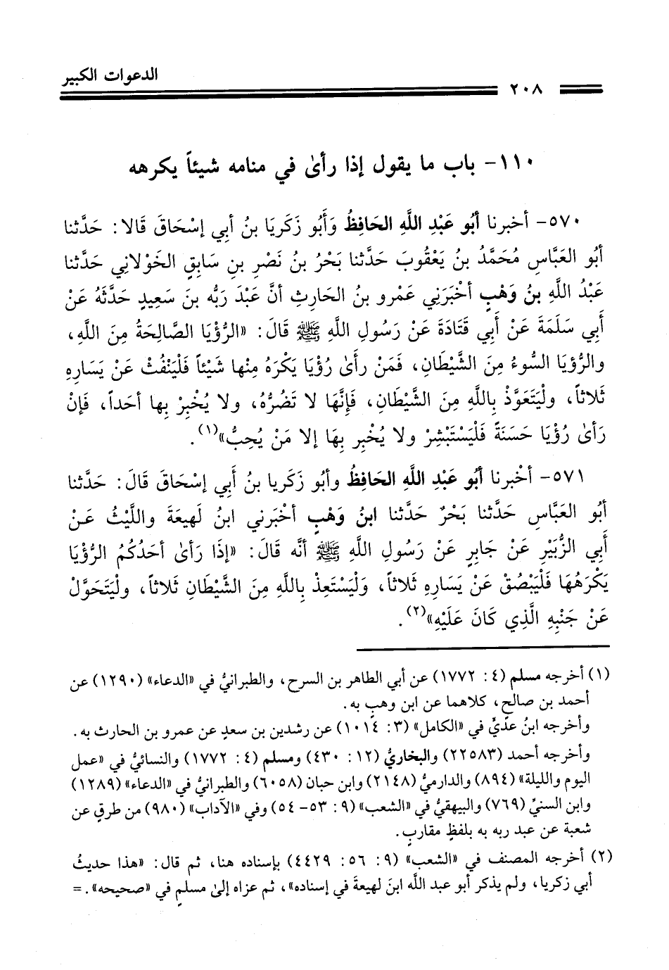 570 - أَنْبَأَنَا أَبُو عَبْدِ اللَّهِ الْحَافِظُ، وَأَبُو زَكَرِيَّا بْنُ أَبِي إِسْحَاقَ قَالَا: حَدَّثَنَا أَبُو الْعَبَّاسِ مُحَمَّدُ بْنُ يَعْقُوبَ، حَدَّثَنَا بَحْرُ بْنُ نَصْرِ بْنِ سَابِقٍ الْخَوْلَانِيُّ، حَدَّثَنَا عَبْدُ اللَّهِ بْنُ وَهْبٍ، أَخْبَرَنِي عَمْرُو بْنُ الْحَارِثِ، أَنَّ عَبْدَ رَبِّهِ بْنَ سَعِيدٍ حَدَّثَهُ، عَنْ أَبِي سَلَمَةَ، عَنْ أَبِي قَتَادَةَ، عَنْ رَسُولِ اللَّهِ صَلَّى اللهُ عَلَيْهِ وَسَلَّمَ قَالَ: «§الرُّؤْيَا الصَّالِحَةُ مِنَ اللَّهِ، وَالرُّؤْيَا السُّوءُ مِنَ الشَّيْطَانِ، فَمَنْ رَأَى رُؤْيَا فَكَرِهَ مِنْهَا شَيْئًا فَلْيَنْفُثْ عَنْ يَسَارِهِ ثَلَاثًا، وَلْيَتَعَوَّذْ بِاللَّهِ مِنَ الشَّيْطَانِ، فَإِنَّهَا لَا تَضُرُّهُ , وَلَا يُخْبِرْ بِهَا أَحَدًا، فَإِنْ رَأَى رُؤْيَا حَسَنَةً فَلْيَسْتَبْشِرْ، وَلَا يُخْبِرْ بِهَا إِلَّا مَنْ يُحِبُّ»