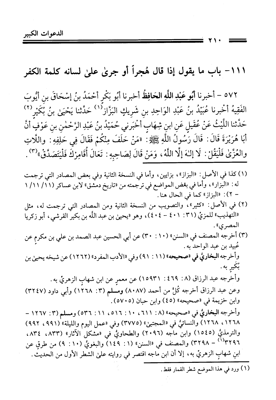 572 - أَنْبَأَنَا أَبُو عَبْدِ اللَّهِ الْحَافِظُ، حَدَّثَنَا أَبُو بَكْرٍ أَحْمَدُ بْنُ إِسْحَاقَ بْنِ أَيُّوبَ الْفَقِيهُ، أَخْبَرَنَا عُبَيْدُ بْنُ عَبْدِ الْوَاحِدِ بْنِ شَرِيكٍ الْبَزَّارُ، حَدَّثَنَا يَحْيَى بْنُ بُكَيْرٍ، حَدَّثَنَا اللَّيْثُ، عَنْ عُقَيْلٍ، عَنِ ابْنِ شِهَابٍ، أَخْبَرَنِي حُمَيْدُ بْنُ عَبْدِ الرَّحْمَنِ بْنِ عَوْفٍ، أَنَّ أَبَا هُرَيْرَةَ، قَالَ: قَالَ رَسُولُ اللَّهِ صَلَّى اللهُ عَلَيْهِ وَسَلَّمَ: " §مَنْ حَلَفَ مِنْكُمْ فَقَالَ فِي حَلِفِهِ وَالَّاتِ وَالْعُزَّى، فَلْيَقُلْ: لَا إِلَهَ إِلَّا اللَّهُ، وَمَنْ قَالَ لِصَاحِبِهِ تَعَالَ أُقَامِرْكَ، فَلْيَتَصَدَّقْ "