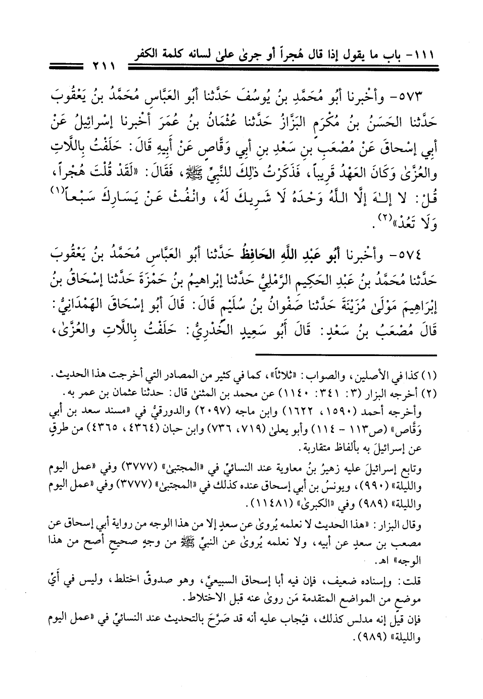 573 - وَأَخْبَرَنَا أَبُو مُحَمَّدِ بْنُ يُوسُفَ، حَدَّثَنَا أَبُو الْعَبَّاسِ مُحَمَّدُ بْنُ يَعْقُوبَ، حَدَّثَنَا الْحَسَنُ بْنُ مُكْرَمٍ الْبَزَّارُ، حَدَّثَنَا عُثْمَانُ بْنُ عُمَرَ، أَنْبَأَنَا إِسْرَائِيلُ، عَنْ أَبِي إِسْحَاقَ، عَنْ مُصْعَبِ بْنِ سَعْدِ بْنِ أَبِي وَقَّاصٍ، عَنْ أَبِيهِ، قَالَ: حَلَفْتُ بِاللَّاتِ وَالْعُزَّى وَكَانَ الْعَهْدُ قَرِيبًا، فَذَكَرْتُ ذَلِكَ لِلنَّبِيِّ صَلَّى اللهُ عَلَيْهِ وَسَلَّمَ فَقَالَ: " §لَقَدْ قُلْتَ هَجْرًا، قُلْ: لَا إِلَهَ إِلَّا اللَّهُ، وَحْدَهُ لَا شَرِيكَ لَهُ , وَانْفُثْ عَنْ يَسَارِكَ سَبْعًا، وَلَا تَعُدْ "