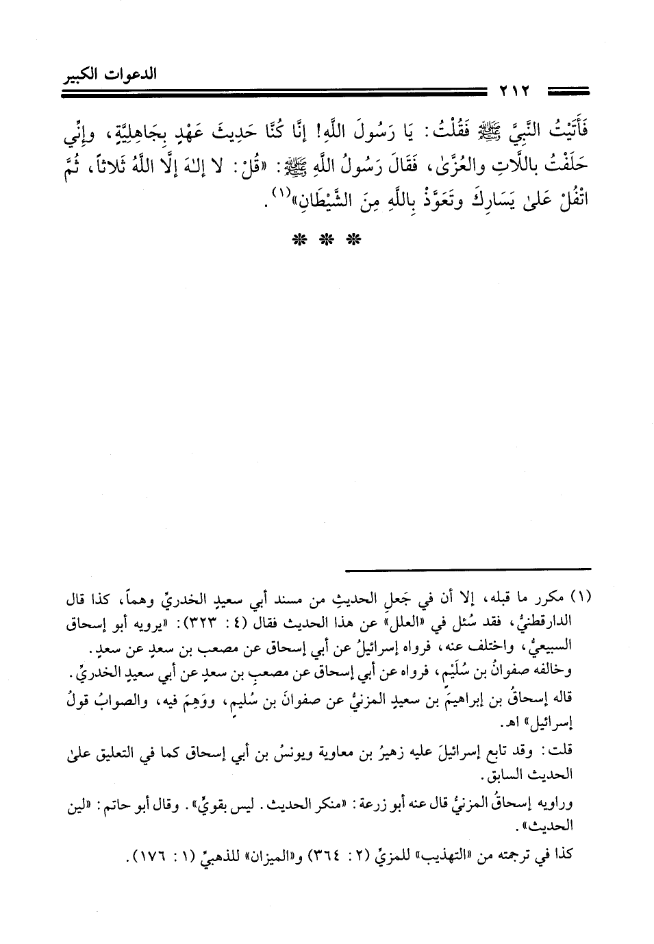 574 - وَأَخْبَرَنَا أَبُو عَبْدِ اللَّهِ الْحَافِظُ، حَدَّثَنَا أَبُو الْعَبَّاسِ مُحَمَّدُ بْنُ يَعْقُوبَ، حَدَّثَنَا مُحَمَّدُ بْنُ عَبْدِ الْحَكِيمِ الرَّمْلِيُّ، حَدَّثَنَا إِبْرَاهِيمُ بْنُ حَمْزَةَ، حَدَّثَنَا إِسْحَاقُ بْنُ إِبْرَاهِيمَ مَوْلَى مُزَيْنَةَ، حَدَّثَنَا صَفْوَانُ بْنُ سُلَيْمٍ، قَالَ: قَالَ أَبُو إِسْحَاقَ الْهَمْدَانِيُّ: قَالَ مُصْعَبُ بْنُ سَعْدٍ: قَالَ أَبُو سَعِيدٍ الْخُدْرِيُّ: حَلَفْتُ بِاللَّات وَالْعُزَّى، فَأَتَيْتُ النَّبِيَّ صَلَّى اللهُ عَلَيْهِ وَسَلَّمَ فَقُلْتُ: يَا رَسُولَ اللَّهِ، إِنَّا كُنَّا حَدِيثِي عَهْدٍ بِجَاهِلِيَّةٍ، وَإِنِّي حَلَفْتُ بِاللَّاتِ وَالْعُزَّى، فَقَالَ رَسُولُ اللَّهِ صَلَّى اللهُ عَلَيْهِ وَسَلَّمَ: " §قُلْ: لَا إِلَهَ إِلَّا اللَّهُ، ثَلَاثًا، ثُمَّ اتْفُلْ عَلَى يَسَارِكَ، وَتَعَوَّذْ بِاللَّهِ مِنَ الشَّيْطَانِ "