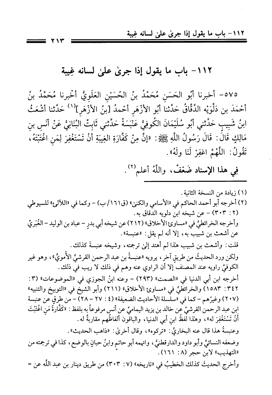575 - أَنْبَأَنَا أَبُو الْحَسَنِ مُحَمَّدُ بْنُ الْحُسَيْنِ الْعَلَوِيُّ، أَخْبَرَنَا مُحَمَّدُ بْنُ أَحْمَدَ بْنِ دَلُّويَهِ الدَّقَّاقُ، حَدَّثَنَا أَبُو الْأَزْهَرِ أَحْمَدُ بْنُ الْأَزْهَرِ، حَدَّثَنَا أَشْعَثُ بْنُ شَبِيبٍ، حَدَّثَنِي أَبُو سُلَيْمَانَ الْكُوفِيُّ عَنْبَسَةُ، حَدَّثَنِي ثَابِتٌ الْبُنَانِيُّ، عَنْ أَنَسِ بْنِ مَالِكٍ، قَالَ: قَالَ رَسُولُ اللَّهِ صَلَّى اللهُ عَلَيْهِ وَسَلَّمَ: " إِنَّ §مِنْ كَفَّارَةِ الْغِيبَةِ أَنْ تَسْتَغْفِرَ لِمَنِ اغْتَبْتَهُ، تَقُولُ: اللَّهُمَّ اغْفِرْ لَنَا وَلَهُ ". فِي هَذَا الْإِسْنَادِ ضَعْفٌ، وَاللَّهُ أَعْلَمُ