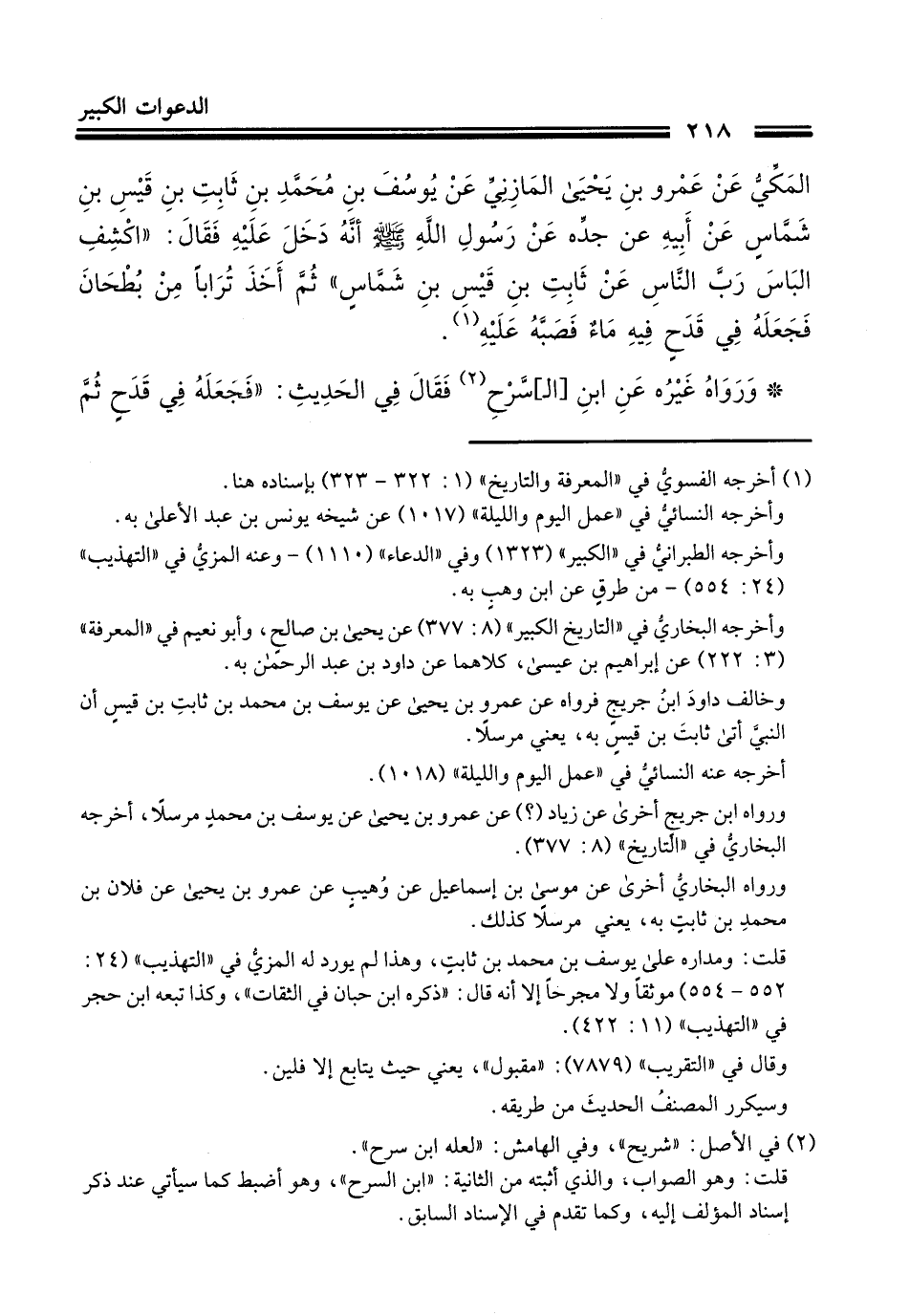 579 - أَخْبَرَنَا أَبُو الْحُسَيْنِ بْنُ الْفَضْلِ الْقَطَّانُ، بِبَغْدَادَ، أَخْبَرَنَا عَبْدُ اللَّهِ بْنُ جَعْفَرِ بْنِ دُرُسْتَوَيْهِ، حَدَّثَنَا يَعْقُوبُ بْنُ سُفْيَانَ، حَدَّثَنِي أَحْمَدُ بْنُ عَمْرِو بْنِ السَّرْحِ، وَيُونُسُ بْنُ عَبْدِ الْأَعْلَى، قَالَا: حَدَّثَنَا ابْنُ وَهْبٍ، حَدَّثَنِي دَاوُدُ بْنُ عَبْدِ الرَّحْمَنِ الْمَكِّيُّ، عَنْ عَمْرِو بْنِ يَحْيَى الْمَازِنِيِّ، عَنْ يُوسُفَ بْنِ مُحَمَّدِ بْنِ ثَابِتِ بْنِ قَيْسِ بْنِ شَمَّاسٍ: عَنْ أَبِيهِ، عَنْ رَسُولِ اللَّهُ عَلَيْهِ وَسَلَّمَ أَنَّهُ دَخَلَ عَلَيْهِ فَقَالَ: «§اكْشِفِ الْبَاسَ، رَبَّ النَّاسِ» ، عَنْ ثَابِتِ بْنِ قَيْسِ بْنِ شَمَّاسٍ «، ثُمَّ أَخَذَ تُرَابًا مِنْ بُطْحَانَ فَجَعَلَهُ فِي قَدَحٍ فِيهِ مَاءٌ فَصَبَّهُ عَلَيْهِ» وَرَوَاهُ غَيْرُهُ عَنِ ابْنِ السَّرْحِ فَقَالَ فِي الْحَدِيثِ: «فَجَعَلَهُ فِي قَدَحٍ ثُمَّ نَفَثَ عَلَيْهِ بِمَاءٍ وَصَبَّهُ عَلَيْهِ»