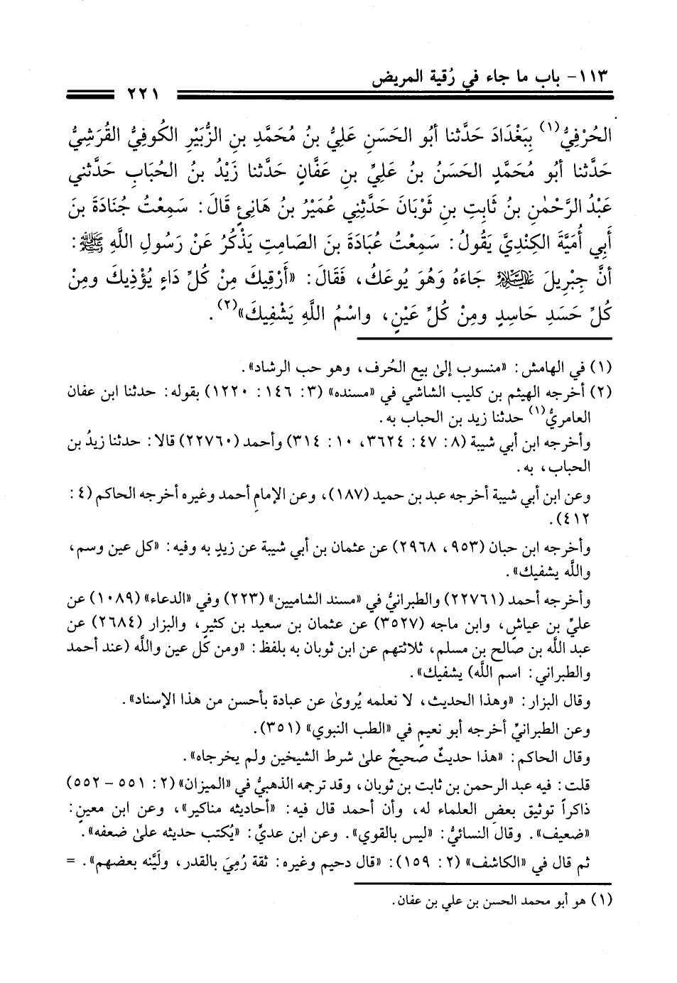 583 - وَأَخْبَرَنَا أَبُو الْقَاسِمِ عَبْدُ الرَّحْمَنِ بْنُ عُبَيْدِ اللَّهِ بْنِ عَبْدِ اللَّهِ الْحُرْفِيُّ، بِبَغْدَادَ، حَدَّثَنَا أَبُو الْحَسَنِ عَلِيُّ بْنُ مُحَمَّدِ بْنِ الزُّبَيْرِ الْكُوفِيُّ الْقُرَشِيُّ، حَدَّثَنَا أَبُو مُحَمَّدٍ الْحَسَنُ بْنُ عَلِيِّ بْنِ عَفَّانَ، حَدَّثَنَا زَيْدُ بْنُ الْحُبَابِ، حَدَّثَنِي عَبْدُ الرَّحْمَنِ بْنُ ثَابِتِ بْنِ ثَوْبَانَ، حَدَّثَنِي عُمَيْرُ بْنُ هَانِئٍ، قَالَ: سَمِعْتُ جُنَادَةَ بْنَ أَبِي أُمَيَّةَ الْكِنْدِيَّ، يَقُولُ: سَمِعْتُ عُبَادَةَ بْنَ الصَّامِتِ، يَذْكُرُ عَنْ رَسُولِ اللَّهِ صَلَّىاللَّهُ عَلَيْهِ وَسَلَّمَ أَنَّ جِبْرِيلَ، عَلَيْهِ السَّلَامُ جَاءَهُ وَهُوَ يُوعَكُ، فَقَالَ: «§أَرْقِيكَ مِنْ كُلِّ دَاءٍ يُؤْذِيكَ، وَمِنْ كُلِّ حَسَدِ حَاسِدٍ، وَمِنْ كُلِّ عَيْنٍ، وَاسْمُ اللَّهِ يَشْفِيكَ»