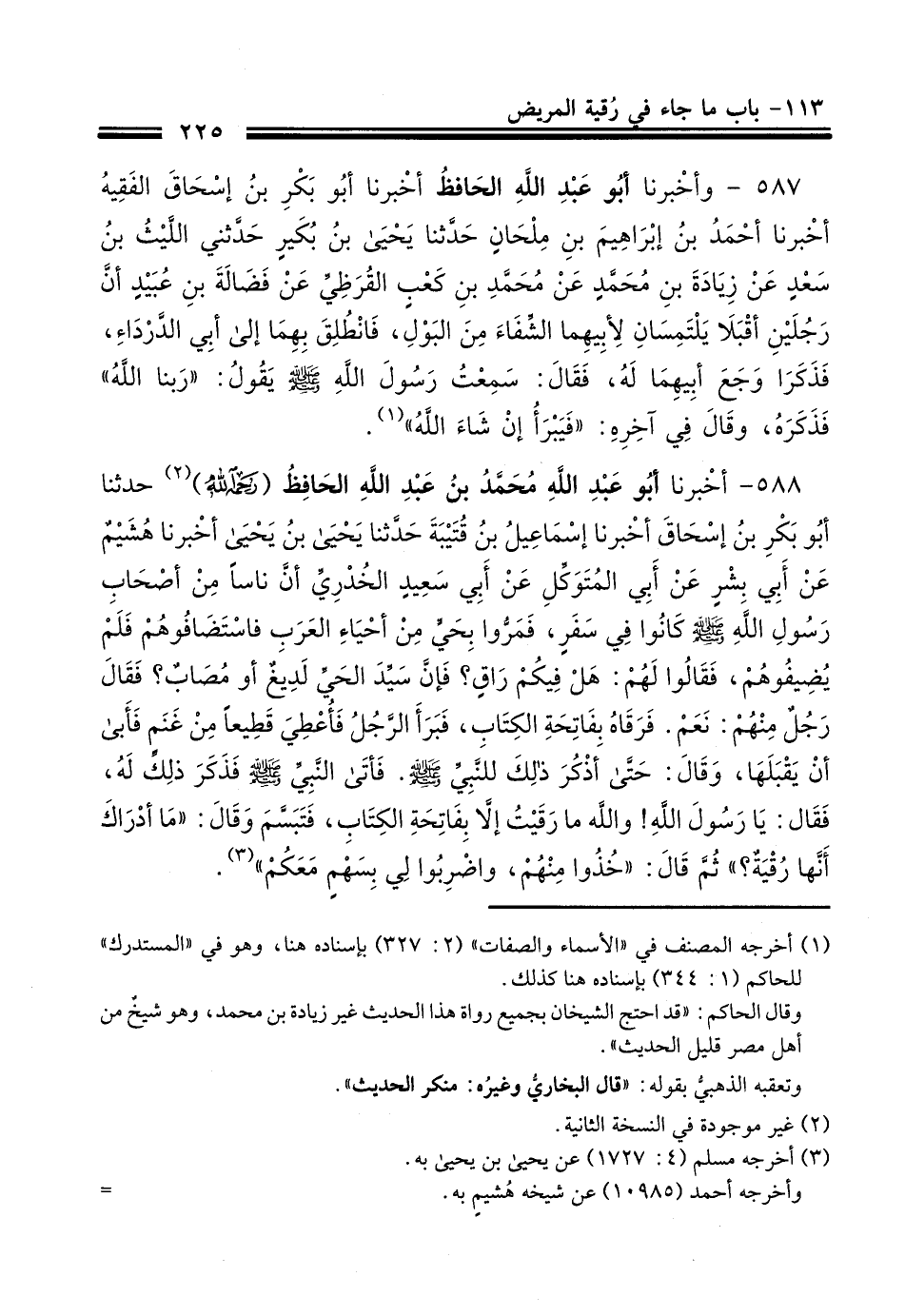 588 - أَخْبَرَنَا أَبُو عَبْدِ اللَّهِ مُحَمَّدُ بْنُ عَبْدِ اللَّهِ الْحَافِظُ، أَخْبَرَنَا أَبُو بَكْرِ بْنُ إِسْحَاقَ، أَخْبَرَنَا إِسْمَاعِيلُ بْنُ قُتَيْبَةَ، حَدَّثَنَا يَحْيَى بْنُ يَحْيَى، أَخْبَرَنَا هُشَيْمٌ، عَنْ أَبَى بِشْرٍ، عَنْ أَبِي الْمُتَوَكِّلِ، عَنْ أَبِي سَعِيدٍ الْخُدْرِيِّ، أَنَّ نَاسًا مِنْ أَصْحَابِ رَسُولِ اللَّهِ صَلَّى اللهُ عَلَيْهِ وَسَلَّمَ كَانُوا فِي سَفَرٍ، فَمَرُّوا بِحَيٍّ مِنْ أَحْيَاءِ الْعَرَبِ فَاسْتَضَافُوهُمْ فَلَمْ يُضَيِّفُوهُمْ، فَقَالُوا لَهُمْ: هَلْ فِيكُمْ رَاقٍ؟ فَإِنَّ سَيِّدَ الْحَيِّ لَدِيغٌ أَوْ مُصَابٌ؟ فَقَالَ رَجُلٌ مِنْهُمْ: نَعَمْ، فَرَقَاهُ بِ فَاتِحَةِ الْكِتَابِ، فَبَرَأَ الرَّجُلُ، فَأُعْطِيَ قَطِيعًا مِنْ غَنَمٍ، فَأَبَى أَنْ يَقْبَلَهَا، وَقَالَ: حَتَّى أَذْكُرَ ذَلِكَ لِلنَّبِيِّ صَلَّى اللهُ عَلَيْهِ وَسَلَّمَ , فَأَتَى النَّبِيَّ صَلَّى اللهُ عَلَيْهِ وَسَلَّمَ فَذَكَرَ ذَلِكَ لَهُ فَقَالَ: يَا رَسُولَ اللَّهِ، وَاللَّهِ مَا رَقِيتُ إِلَّا بِ فَاتِحَةِ الْكِتَابِ، فَتَبَسَّمَ وَقَالَ: «§مَا أَدْرَاكَ أَنَّهَا رُقْيَةٌ؟» ثُمَّ قَالَ: «خُذُوا مِنْهُمْ، وَاضْرِبُوا لِي بِسَهْمٍ مَعَكُمْ» . وَرَوَاهُ شُعْبَةُ بْنُ الْحَجَّاجِ , عَنْ أَبِي بِشْرٍ بِمَعْنَاهُ وَقَالَ فِي الْحَدِيثِ: فَجَعَلَ يَقْرَأُ بِأُمِّ الْكِتَابِ وَيَجْمَعُ بُزَاقَهُ وَيَتْفِلُ، فَبَرَأَ