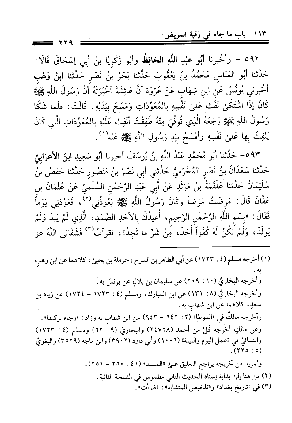 592 - وَأَخْبَرَنَا أَبُو عَبْدِ اللَّهِ الْحَافِظُ، وَأَبُو زَكَرِيَّا بْنُ أَبِي إِسْحَاقَ قَالَا: حَدَّثَنَا أَبُو الْعَبَّاسِ مُحَمَّدُ بْنُ يَعْقُوبَ، حَدَّثَنَا بَحْرُ بْنُ نَصْرٍ، حَدَّثَنَا ابْنُ وَهْبٍ، أَخْبَرَنِي يُونُسُ، عَنِ ابْنِ شِهَابٍ، عَنْ عُرْوَةَ، أَنَّ عَائِشَةَ، أَخْبَرَتْهُ أَنَّ رَسُولَ اللَّهِ صَلَّى اللهُ عَلَيْهِ وَسَلَّمَ كَانَ §إِذَا اشْتَكَى نَفَثَ عَلَى نَفْسِهِ بِالْمُعَوِّذَاتِ وَمَسَحَ بِيَدَيْهِ، قَالَتْ: فَلَمَّا شَكَا رَسُولُ اللَّهِ صَلَّى اللهُ عَلَيْهِ وَسَلَّمَ وَجَعَهُ الَّذِي تُوُفِّيَ مِنْهُ طَفِقْتُ أَنْفُثُ عَلَيْهِ بِالْمُعَوِّذَاتِ الَّتِي كَانَ يَنْفُثُ بِهَا عَلَى نَفْسِهِ وَأَمْسَحُ بِيَدِ رَسُولِ اللَّهِ صَلَّى اللهُ عَلَيْهِ وَسَلَّمَ عَنْهُ