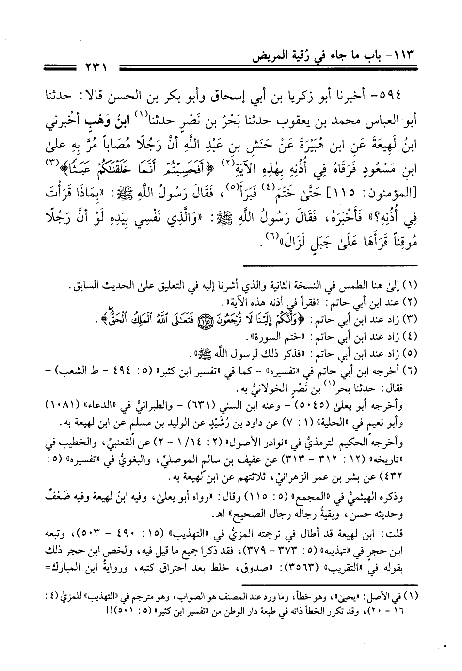 594 - أَخْبَرنا أبو زكريا بن أبي إسحاف وأبو بكر بن الحسن قالا حدثنا أبو العباس محمد بن يعقوب حدثنا بحر بن نصر حدثنا ابْنُ وَهْبٍ، أَخْبَرَنِي ابْنُ لَهِيعَةَ، عَنِ ابْنِ هُبَيْرَةَ، عَنْ حَنَشِ بْنِ عَبْدِ اللَّهِ، أَنَّ رَجُلًا مُصَابًا مَرَّ بِهِ عَبْدُ اللَّهِ بْنُ مَسْعُودٍ، فَرَقَاهُ فِي أُذُنِهِ بِهَذِهِ الْآيَةِ: {أَفَحَسِبْتُمْ أَنَّمَا خَلَقْنَاكُمْ عَبَثًا} [المؤمنون: 115] ، حَتَّى خَتَمَ، فَبَرَأَ، فَذَكَرَ ذَلِكَ لِرَسُولِ اللَّهِ صَلَّى اللهُ عَلَيْهِ وَسَلَّمَ، فَقَالَ رَسُولُ اللَّهِ صَلَّى اللهُ عَلَيْهِ وَسَلَّمَ: «§بِمَاذَا قَرَأْتَ فِي أُذُنِهِ؟» فَأَخْبَرَهُ، فَقَالَ رَسُولُ اللَّهِ صَلَّى اللهُ عَلَيْهِ وَسَلَّمَ: «وَالَّذِي نَفْسِي بِيَدِهِ، لَوْ أَنَّ رَجُلًا مُوقِنًا قَرَأَهَا عَلَى جَبَلٍ لَزَالَ»