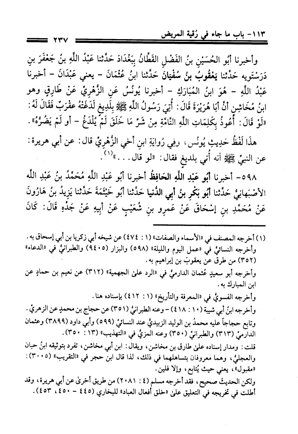 597 - أَخْبَرَنَا أَبُو عَبْدِ اللَّهِ الْحَافِظُ، وَأَبُو زَكَرِيَّا بْنُ أَبِي إِسْحَاقَ الْمُزَكِّي، قَالَا: أَخْبَرَنَا أَبُو بَكْرِ بْنُ أَحْمَدَ بْنِ كَامِلٍ، حَدَّثَنَا مُحَمَّدُ بْنُ سَعْدٍ الْعَوْفِيُّ، حَدَّثَنَا يَعْقُوبُ بْنُ إِبْرَاهِيمَ بْنِ سَعْدٍ، حَدَّثَنَا ابْنُ أَخِي الزُّهْرِيِّ ابْنُ أَخِي مُحَمَّدٍ، عَنْ عَمِّهِ، حَدَّثَنِي طَارِقُ بْنُ مُخَاشِنٍ، وَأَنْبَأَنَا أَبُو الْحُسَيْنِ بْنُ الْفَضْلِ الْقَطَّانُ، بِبَغْدَادَ، حَدَّثَنَا عَبْدُ اللَّهِ بْنُ جَعْفَرِ بْنِ دُرُسْتَوَيْهِ، حَدَّثَنَا يَعْقُوبُ بْنُ سُفْيَانَ، حَدَّثَنَا ابْنُ عُثْمَانَ يَعْنِي عَبْدَانَ، حَدَّثَنَا عَبْدُ اللَّهِ هُوَ ابْنُ الْمُبَارَكِ , أَنْبَأَنَا يُونُسُ، عَنِ الزُّهْرِيِّ، عَنْ طَارِقِ بْنِ مُخَاشِنٍ، أَنَّ أَبَا هُرَيْرَةَ، قَالَ: أُتِيَ رَسُولُ اللَّهِ صَلَّى اللهُ عَلَيْهِ وَسَلَّمَ بِلَدِيغٍ لَدَغَتْهُ عَقْرَبٌ، فَقَالَ لَهُ: " §لَوْ قَالَ: أَعُوذُ بِكَلِمَاتِ اللَّهِ التَّامَّةِ مِنْ شَرِّ مَا خَلَقَ , لَمْ يُلْدَغْ أَوْ لَمْ يَضُرَّهُ " هَذَا لَفْظُ حَدِيثِ يُونُسَ، وَفِي رِوَايَةِ ابْنِ أَخِي الزُّهْرِيِّ وَهُوَ ابْنُ أَخِي مُحَمَّدٍ: عَنِ النَّبِيِّ صَلَّى اللهُ عَلَيْهِ وَسَلَّمَ أَنَّهُ أُتِيَ بِلَدِيغٍ فَقَالَ: «لَوْ قَالَ»