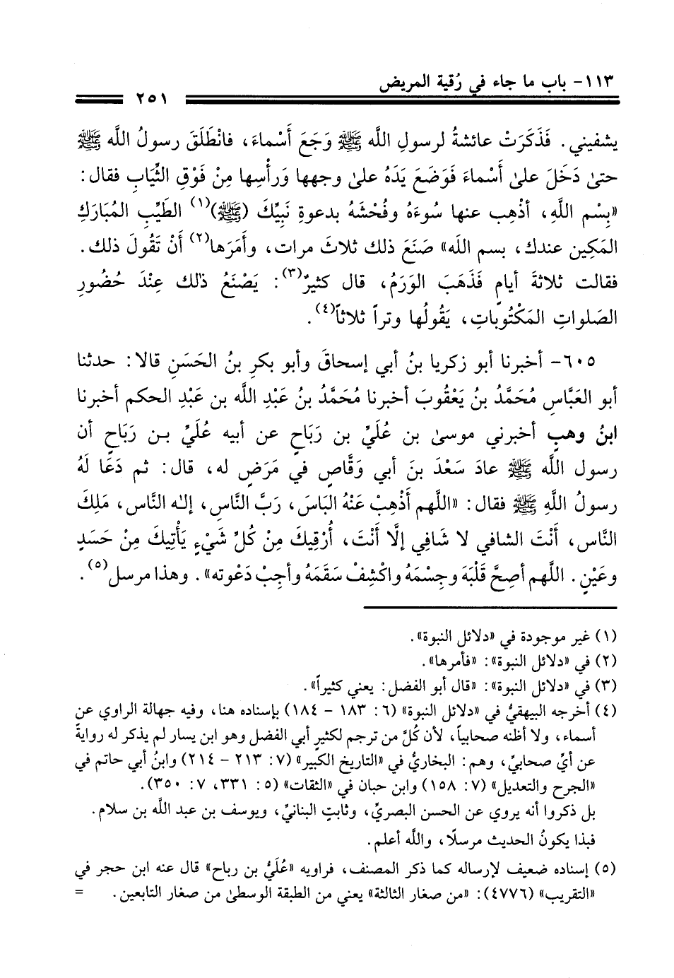 605- أَخْبَرنَا أبو زكريا بن أبي إسحاق وأبو بَكْر بن الحَسَن قالا حَدَّثَنا أبو العباس محمد بن يعقوب أَخْبَرنَا محمد بن عبد الله بن عبد الحكم أَخْبَرنَا ابن وهب أَخْبَرَنِي موسى بن علي بن رباح , عن أبيه علي بن رباح أن رسول الله صلى الله عليه وسلم عاد سعد بن أبي وقاص رضي الله عنه , في مرض له قال ثم دعا له رسول الله صلى الله عليه وسلم فقال اللهم أذهب عنه الباس رب الناس إله الناس ملك الناس أنت الشافي لا شافي إلا أنت أرقيك من كل شيء يأتيك من حسد وعين اللهم أصح قلبه وجسمه واكشف سقمه وأجب دعوته.