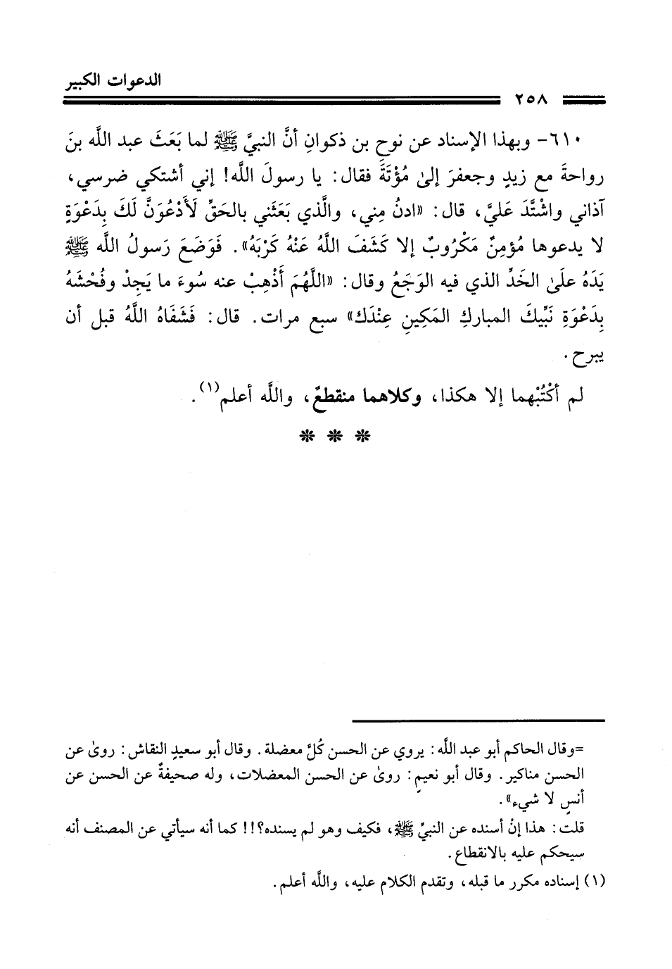610- وبهذا الإسناد عن نُوحِ بْنِ ذَكْوَانَ، أَنَّ النَّبِيَّ صَلَّى اللَّهُ عَلَيْهِ وَسَلَّمَ لَمَّا بَعَثَ عَبْدَ اللهِ بْنَ رَوَاحَةَ مَعَ زَيْدٍ وَجَعْفَرٍ إِلَى مُؤْتَةَ، فَقَالَ: يَا رَسُولَ اللهِ، إِنِّي أَشْتَكِي ضِرْسِي، آذَانِي وَاشْتَدَّ عَلَيَّ، قَالَ: ادْنُ مِنِّي، وَالَّذِي بَعَثَنِي بِالْحَقِّ لأَدْعُوَنَّ لَكَ بِدَعْوَةٍ لاَ يَدْعُو بِهَا مُؤْمِنٌ مَكْرُوبٌ إِلاَّ كَشَفَ اللَّهُ عَنْهُ كَرْبَهُ، فَوَضَعَ رَسُولُ اللهِ صَلَّى اللَّهُ عَلَيْهِ وَسَلَّمَ يَدَهُ عَلَى الْخَدِّ الَّذِي فِيهِ الْوَجَعُ، وَقَالَ: اللَّهُمَّ أَذْهِبْ عَنْهُ سُوءَ مَا يَجِدُ وَفُحْشَهُ بِدَعْوَةِ نَبِيِّكَ الْمُبَارَكِ الْمَكِينِ عِنْدَكَ سَبْعَ مَرَّاتٍ، قَالَ: فَشَفَاهُ اللَّهُ عَزَّ وَجَلَّ قَبْلَ أَنْ يَبْرَحَ.