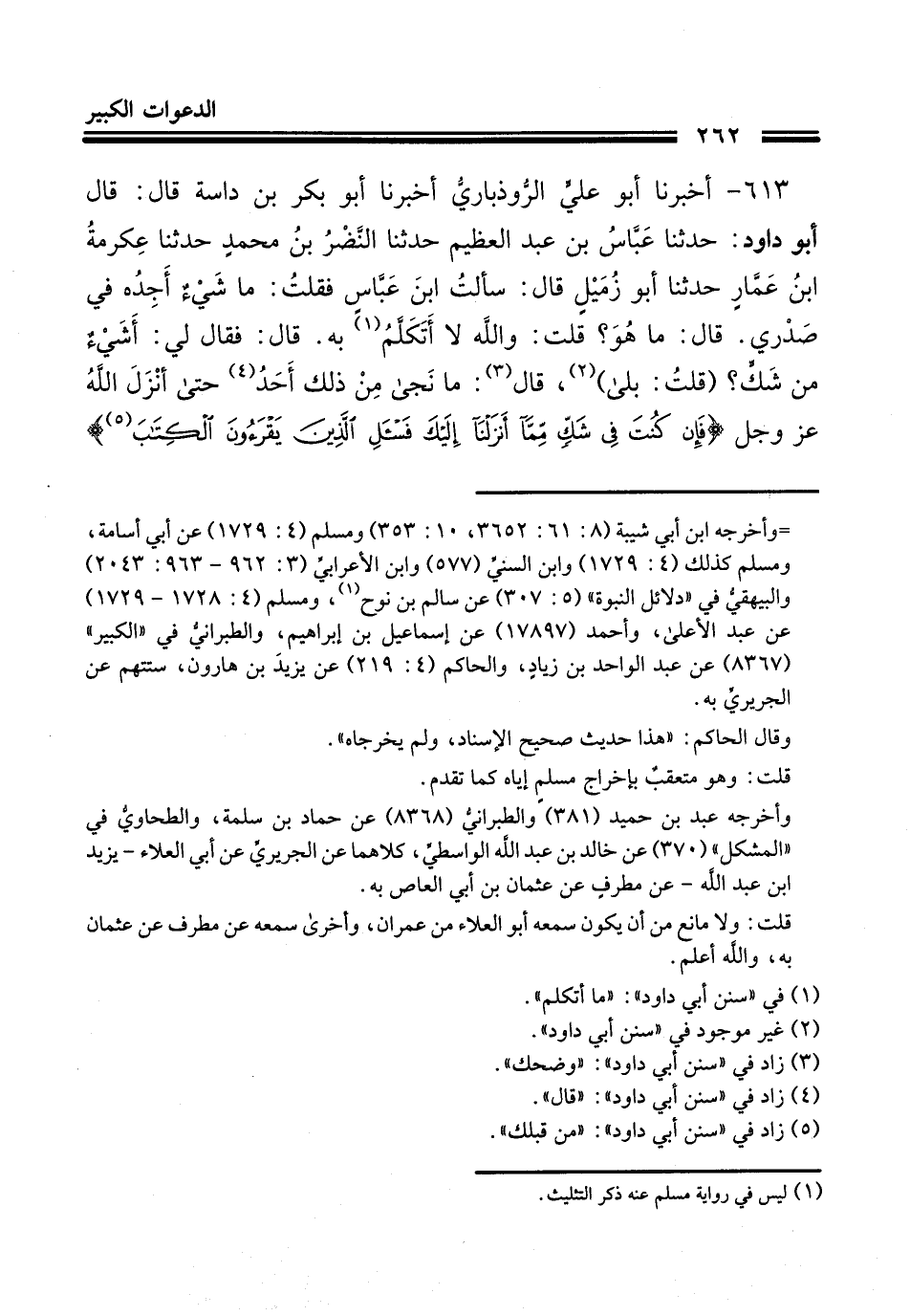 613- أَخْبَرنَا أبو علي الزذباري أَخْبَرنَا أبو بَكْر بن داسة قال: قال أبو داود حدثنا عباس بن عبد العظيم، حدثنا النضر بن محمد، حدثنا عكرمة بن عمار حدثنا أبو زميل، قال: سألت ابن عباس فقلت: ما شيء أجده في صدري؟ قال: ما هو؟ قلت: والله ما أتكلم به، قال: فقال لي: أشيء من شك؟ قلت بلى، قال: ما نجا من ذلك أحد، حتى أنزل الله عز وجل {فإن كنت في شك مما أنزلنا إليك فاسأل الذين يقرؤون الكتاب} ، الآية قال: فقال لي: إذا وجدت في نفسك شيئا فقل {هو الأول والآخر والظاهر والباطن وهو بكل شيء عليم} .