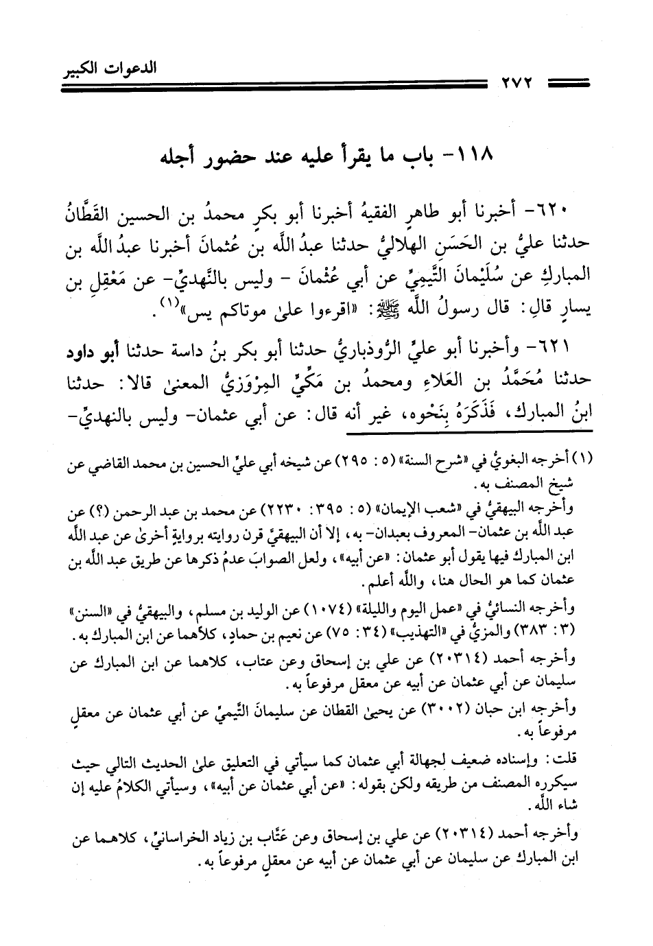 620- أَخْبَرَنَا أَبُو طَاهِرٍ الفقيه، أَخْبَرَنَا أَبُو بَكْرٍ مُحَمَّدُ بْنُ الْحُسَيْنِ الْقَطَّانُ، حَدَّثَنَا عَلِيُّ بْنُ الحُسَين الهلالي، حَدَّثَنا عَبْدُ اللهِ بْنُ عُثْمَانَ، أَخْبَرَنَا عَبْدُ اللهِ بْنُ الْمُبَارَكِ، عَنْ سُلَيْمَانَ التَّيْمِيِّ، عَنْ أَبِي عُثْمَانَ وَلَيْسَ بِالنَّهْدِيِّ، عَنْ مَعْقِلِ بْنِ يَسَارٍ، قَالَ: قَالَ رَسُولُ اللهِ صَلَّى اللَّهُ عَلَيْهِ وَسَلَّمَ: اقْرَؤُوا عَلَى مَوْتَاكُمْ {يَس} .