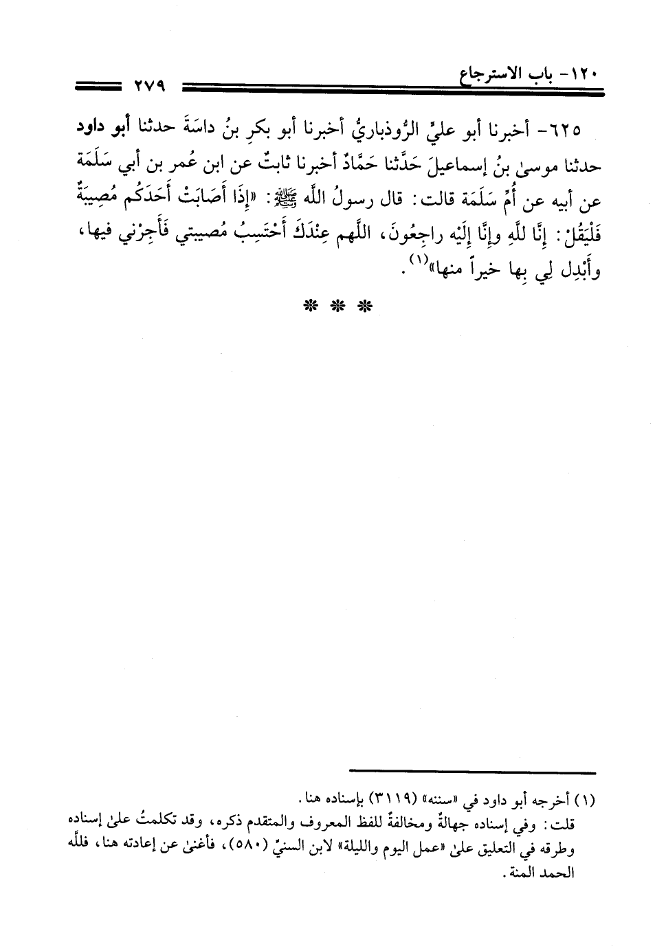 625- أَخْبَرنا أبو علي الرذباري أَخْبَرنَا أبو بَكْر بن داسة حَدَّثَنا أبو داود حَدَّثَنا موسى بن إسماعيل حَدَّثَنا حماد أَخْبَرنَا ثابت عن ابن عُمَر ابن أبي سلمة , عن أبيه عن أم سَلَمَة رضي الله عنها قالت قال رسول الله صلى الله عليه وسلم إذا أصابت أحدكم مصيبة فليقل إنا لله وإنا إليه راجعون اللهم عندك أحتسب مصيبتي فأجرني فيها وأبدل لي بها خيرا منها.