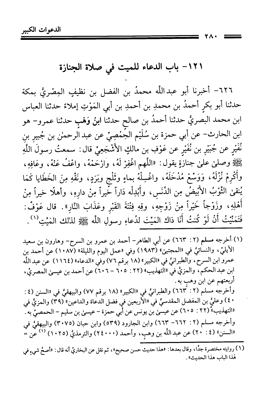 626- أَخْبَرنا أبو عبد الله محمد بن الفضل بن نظيف المصري بمكة حَدَّثَنا أبو بَكْر أحمد بن محمد بن أحمد بن أبي الموت إملاء حَدَّثَنا العباس بن محمد البصري حَدَّثَنا أحمد بن صالح حَدَّثَنا ابْنِ وَهْبٍ، حَدَّثَنا عَمْرُو هو ابْنُ الْحَارِثِ، عَنْ أَبِي حَمْزَةَ بْنِ سُلَيْمٍ الحمصي، عَنْ عَبْدِ الرَّحْمَنِ بْنِ جُبَيْرٍ بن نفير، عَنْ جبير بن نفير، عَنْ عَوْفِ بْنِ مَالِكٍ الأشجعي، قَالَ: سَمِعْتُ رَسُولَ اللهِ صَلَّى اللَّهُ عَلَيْهِ وَسَلَّمَ وصَلَّى عَلَى جِنَازَةٍ , فَقَالَ: اللَّهُمَّ اغْفِرْ لَهُ , وَارْحَمْهُ , وَاعْفُ عَنْهُ , وَعَافِهِ , وَأَكْرِمْ نُزَلَهُ , وَوَسِّعْ مُدْخَلَهُ , وَاغْسِلْهُ بِمَاءٍ وَثَلْجٍ وَبَرَدٍ , وَنَقِّهِ مِنَ الْخَطَايَا كَمَا يُنَقَّى الثَّوْبُ الأَبْيَضُ مِنَ الدَّنَسِ , وَأَبْدِلْهُ دَارًا خَيْرًا مِنْ دَارِهِ , وَأَهْلاً خَيْرًا مِنْ أَهْلِهِ , وَزَوْجًا خَيْرًا مِنْ زَوْجِهِ , وَوَقِّهِ فِتْنَةَ الْقَبْرِ وَعَذَابَ النَّارِ , قَالَ عَوْفٌ: فَتَمَنَّيْتُ أَنْ لَوْ كُنْتُ أنا الْمَيِّتَ لِدُعَاءِ رَسُولِ اللهِ صَلَّى اللَّهُ عَلَيْهِ وَسَلَّمَ لِذَلِكَ الْمَيِّتِ.