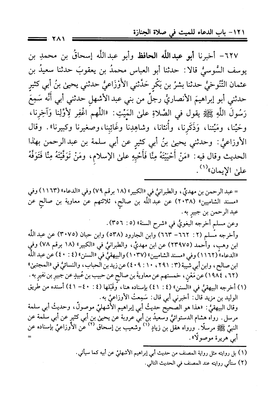 627- أَخْبَرَنَا أَبُو عَبْدِ اللَّهِ الْحَافِظُ، وَأَبُو عَبْدِ اللَّهِ إِسْحَاقُ بْنُ مُحَمَّدِ بْنِ يُوسُفَ السُّوسِيُّ قَالاَ: حَدَّثَنَا أَبُو الْعَبَّاسِ محمد بن يعقوب، حَدَّثَنَا سَعِيدُ بْنُ عُثْمَانَ التَّنُوخِيُّ، حَدَّثَنَا بِشْرُ بْنُ بَكْرٍ، حَدَّثَنِي الأَوْزَاعِيُّ، حَدَّثَنِي يَحْيَى بْنُ أَبِي كَثِيرٍ، حَدَّثَنِي أَبُو إِبْرَاهِيمَ الأنصاريّ رَجُلٌ مِنْ بَنِي عَبْدِ الأَشْهَلِ، حَدَّثَنِي أَبِي: أَنَّهُ سَمِعَ رَسُولَ اللَّهِ صَلَّى اللَّهُ عَلَيْهِ وَسَلَّمَ، يَقُولُ فِي الصَّلاَةِ عَلَى الْمَيِّتِ: اللَّهُمَّ اغْفِرْ لِأَوَّلَنَا وَآخِرِنَا، وَحَيِّنَا وَمَيِّتِنَا، وَذَكَرِنَا وَأُنْثَانَا وَشَاهِدِنَا وَغَائِبِنَا، وَصَغِيرِنَا وَكَبِيرِنَا.