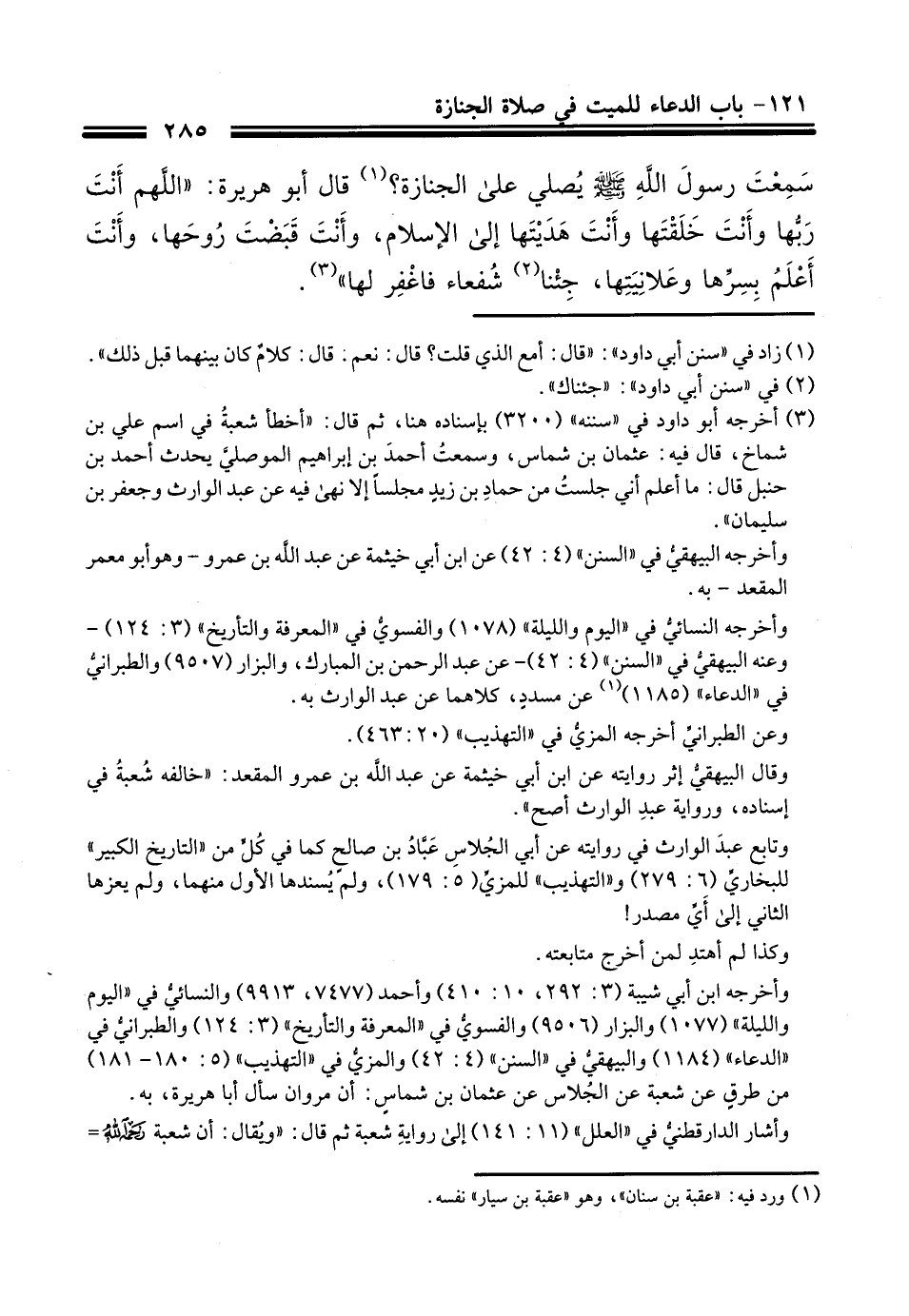 629- حَدَّثَنا أبو علي الرذباري أَخْبَرنَا أبو بَكْر بن داسة حَدَّثَنا أبو داود حَدَّثَنَا أَبُو مَعْمَرٍ عَبْدُ اللهِ بْنُ عَمْرٍو، حَدَّثَنَا عَبْدُ الْوَارِثِ، حَدَّثَنَا أَبُو الْجُلاَسِ عُقْبَةُ بْنُ سَيَّارٍ حَدَّثَنِي عَلِيُّ بْنُ شَمَّاخٍ، قَالَ: شَهِدْتُ مَرْوَانَ سَأَلَ أَبَا هُرَيْرَةَ رضي الله عنه كَيْفَ سَمِعْتَ رَسُولَ اللهِ صَلَّى اللَّهُ عَلَيْهِ وَسَلَّمَ يُصَلِّي عَلَى الْجَنَازَةِ؟ قَالَ أَبُو هُرَيْرَةَ: اللَّهُمَّ أَنْتَ رَبُّهَا، وَأَنْتَ خَلَقْتَهَا، وَأَنْتَ هَدَيْتَهَا لِلإِسْلاَمِ، وَأَنْتَ قَبَضْتَ رُوحَهَا، وَأَنْتَ أَعْلَمُ بِسِرِّهَا وَعَلاَنِيَتِهَا، جِئْنَا شُفَعَاءَ فَاغْفِرْ لَها.