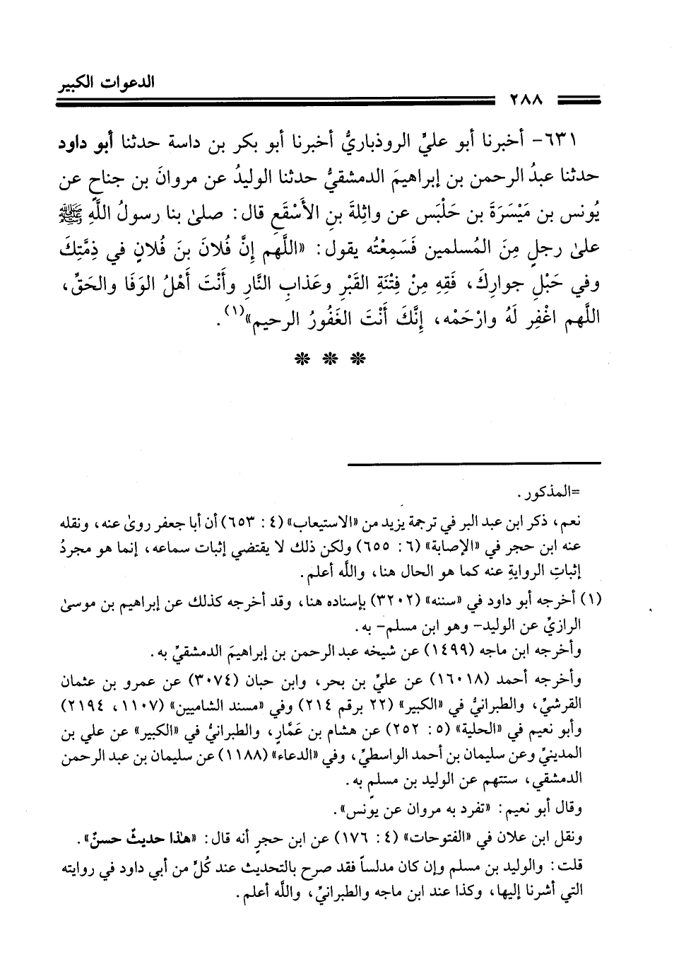 631- أَخْبَرنَا أبو علي الرذباري أَخْبَرنَا أبو بكر بن داسة حَدَّثَنَا أبو داود حَدَّثَنا عَبْدُ الرَّحْمَنِ بْنُ إِبْرَاهِيمَ الدِّمَشْقِيُّ، حَدَّثَنَا الْوَلِيدُ عن مَرْوَانُ بْنُ جَنَاحٍ، عَنْ يُونُسَ بْنِ مَيْسَرَةَ بْنِ حَلْبَسٍ، عَنْ وَاثِلَةَ بْنِ الأَسْقَعِ، قَالَ: صَلَّى بِنَا رَسُولُ اللهِ صَلَّى اللَّهُ عَلَيْهِ وَسَلَّمَ عَلَى رَجُلٍ مِنَ الْمُسْلِمِينَ، فَسَمِعْتُهُ يَقُولُ: اللَّهُمَّ إِنَّ فُلاَنَ بْنَ فُلاَنٍ فِي ذِمَّتِكَ، وفي حبل جوارك من فَقِهِ فِتْنَةَ الْقَبْرِ وعذاب النار , وَأَنْتَ أَهْلُ الْوَفَاءِ والحق، اللَّهُمَّ فَاغْفِرْ لَهُ وَارْحَمْهُ إِنَّكَ أَنْتَ الْغَفُورُ الرَّحِيمُ.