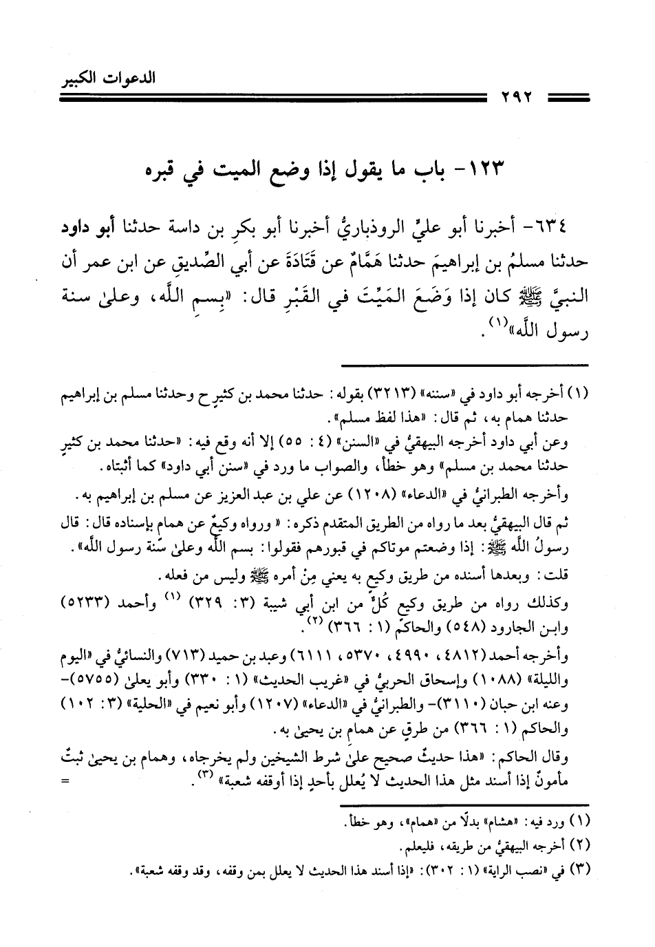 634- أَخْبَرنا أبو علي الرذباري أَخْبَرنَا أبو بَكْر بن داسة حَدَّثَنا أبو داود حَدَّثَنَا مُسْلِمُ بْنُ إِبْرَاهِيمَ، حَدَّثَنَا هَمَّامٌ، عَنْ قَتَادَةَ، عَنْ أَبِي الصِّدِّيقِ، عَنِ ابْنِ عُمَرَ رضي الله عنهما، أَنَّ النَّبِيَّ صَلَّى اللَّهُ عَلَيْهِ وَسَلَّمَ، كَانَ إِذَا وَضَعَ الْمَيِّتَ فِي الْقَبْرِ قَالَ: بِسْمِ اللهِ وَعَلَى سُنَّةِ رَسُولِ اللهِ صَلَّى اللَّهُ عَلَيْهِ وَسَلَّمَ.