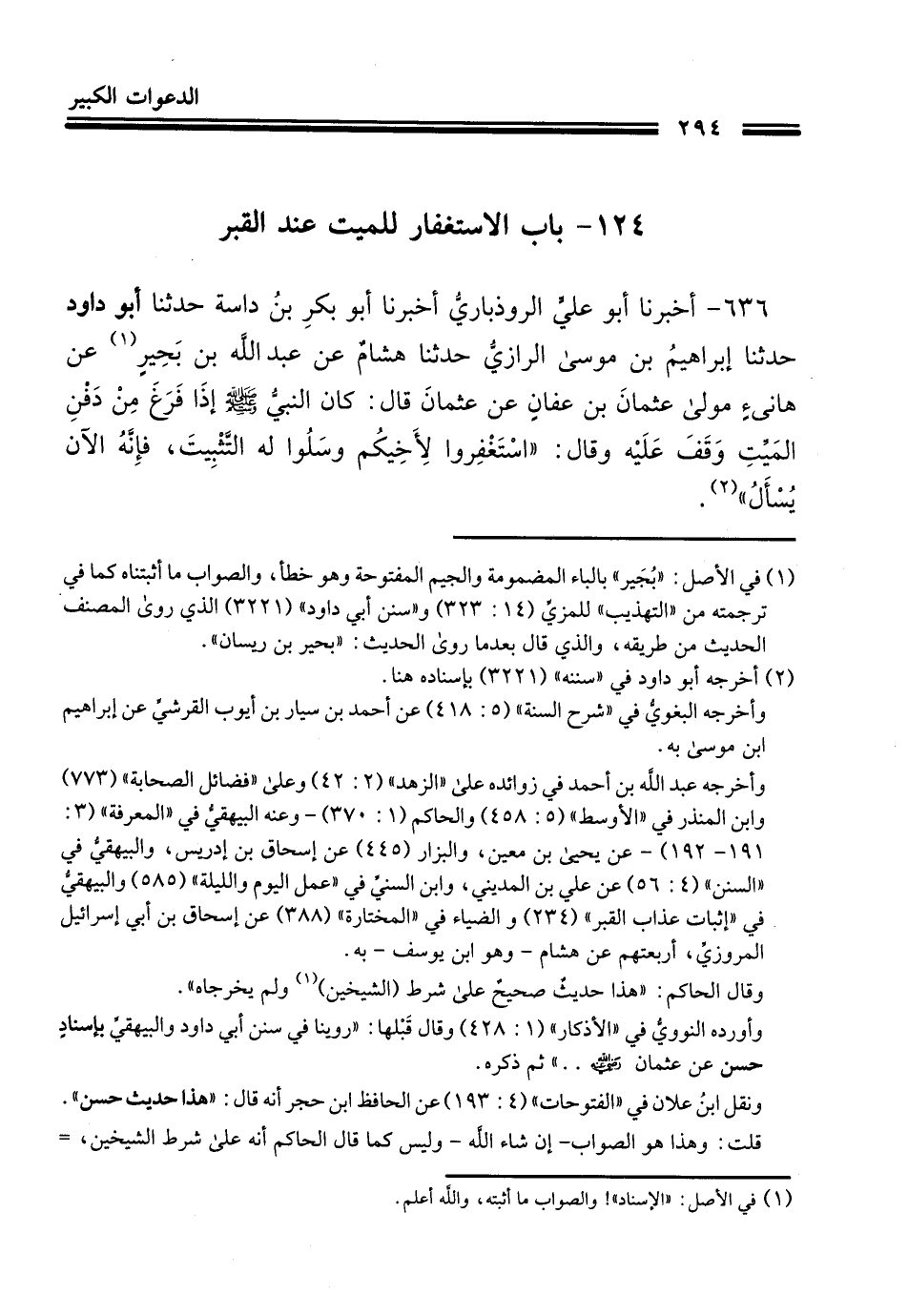 636- أَخْبَرنا أبو علي الرذباري أَخْبَرنَا أبو بَكْر بن داسة حَدَّثَنا أبو داود حَدَّثَنَا إِبْرَاهِيمُ بْنُ مُوسَى الرَّازِيُّ، حَدَّثَنَا هِشَامٌ، عَنْ عَبْدِ اللهِ بْنِ بَحِيرٍ، عَنْ هَانِئٍ، مَوْلَى عُثْمَانَ بن عفان، عَنْ عُثْمَانَ رضي الله عنه، قَالَ: كَانَ النَّبِيُّ صَلَّى اللَّهُ عَلَيْهِ وَسَلَّمَ، إِذَا فَرَغَ مِنْ دَفْنِ الْمَيِّتِ وَقَفَ عَلَيْهِ، فَقَالَ: اسْتَغْفِرُوا لأَخِيكُمْ، وَسَلُوا لَهُ بِالتَّثْبِيتِ، فَإِنَّهُ الآنَ يُسْأَلُ.