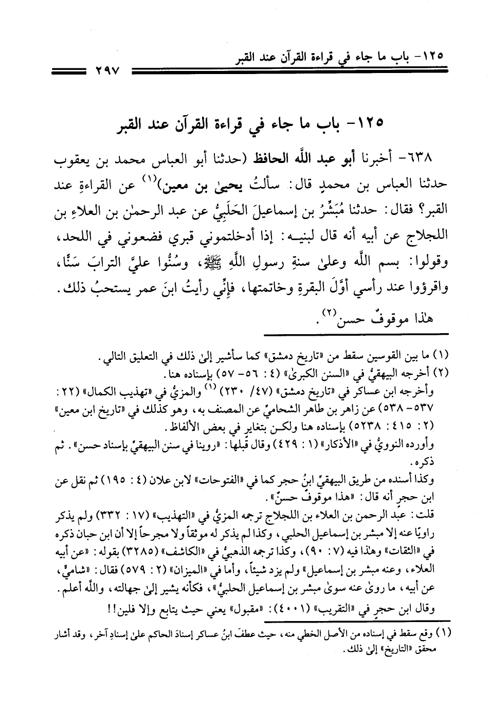 638- أَخْبَرنا أَبُو عَبْدِ اللهِ الْحَافِظُ، حَدَّثَنَا أَبُو الْعَبَّاسِ مُحَمَّدُ بْنُ يَعْقُوبَ , حَدَّثَنَا الْعَبَّاسُ بْنُ مُحَمَّدٍ، قَالَ: سَأَلْتُ يَحْيَى بْنَ مَعِينٍ عَنِ الْقِرَاءَةِ عِنْدَ الْقَبْرِ فَقَالَ: حَدَّثَنَا مُبَشِّرُ بْنُ إِسْمَاعِيلَ الْحَلَبِيُّ، عَنْ عَبْدِ الرَّحْمَنِ بْنِ الْعَلاَءِ بْنِ اللَّجْلاَجِ، عَنْ أَبِيهِ، أَنَّهُ قَالَ لِبَنِيهِ: إِذَا أَدْخَلْتُمُونِي قَبْرِي فَضَعُونِي فِي اللَّحْدِ وَقُولُوا: بِاسْمِ اللهِ وَعَلَى سُنَّةِ رَسُولِ اللهِ صَلَّى اللَّهُ عَلَيْهِ وَسَلَّمَ , وَسُنُّوا عَلَيَّ التُّرَابَ سَنًّا وَاقْرَؤُوا عِنْدَ رَأْسِي أَوَّلَ الْبَقَرَةِ وَخَاتِمَتَهَا فَإِنِّي رَأَيْتُ ابْنَ عُمَرَ يَسْتَحِبُّ ذَلِكَ.