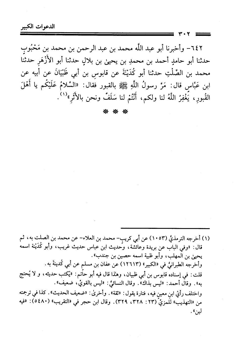 642- وأَخْبَرنَا أبو عبد الله محمد بن عبد الرحمن بن محمد بن محبوب حَدَّثَنا أبو حامد أحمد بن محمد بن يحيى بن بلال حَدَّثَنا أبو الأزهر حَدَّثَنا محمد بن الصلت حَدَّثَنا أبو كدينة عن قابوس بن أبي ظبيان , عن أبيه عن ابن عباس رضي الله عنهما قال مر رسول الله صلى الله عليه وسلم بالقبور فقال السلام عليكم يا أهل القبور يغفر الله لنا ولكم أنتم لنا سلف ونحن بالأثر.