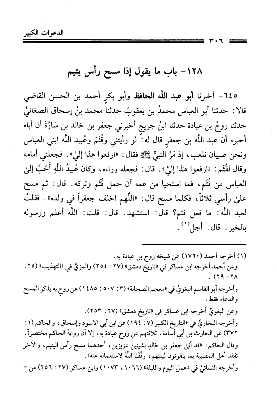 645- أَخْبَرنَا أبو عبد الله الحافظ وأبو بَكْر أحمد بن الحَسَن القاضي قالا حَدَّثَنا أبو العباس محمد بن يعقوب حَدَّثَنا محمد بن إسحاق الصغاني حَدَّثَنا روح بن عبادة حَدَّثَنا ابن جُرَيْج أَخْبَرَنِي جعفر بن خالد بن سارة أن أباه أخبره أن عبد الله بن جعفر قال له لو رأيتني وقثم وعبيد الله ابني العباس ونحن صبيان نلعب إذ مر النبي صلى الله عليه وسلم فقال ارفعوا هذا إلي فجعلني أمامه وقال لقثم ارفعوا هذا إلي قال فجعله وراءه وكان عبيد الله أحب إلى العباس من قثم فما استحيا من عمه أن حمل قثم وتركه قال ثم مسح على رأسي ثلاثا فكلما مسح قال اللهم اخلف جعفرا في ولده فقلت لعبد الله ما فعل قثم قال استشهد قال قلت الله أعلم ورسوله بالخير قال أجل.
