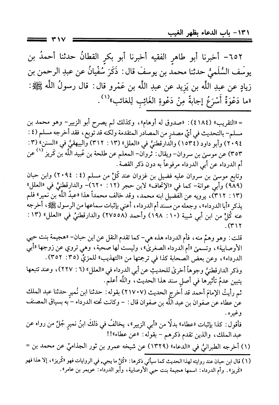 652- أَخْبَرنا أبو طاهر الفقيه أَخْبَرنا اك القطا حدثنا أحمد بن يوسف السلمي حدثنا محمد بن يوسف قال ذكر سفيان عن عَبْد الرَّحْمن بن زياد عن عبد الله بن يزيد عن عَبْد الله بن عمرو رضي الله عنهما , قال قال رسول الله صلى الله عليه وسلم ما دعوة أسرع إجابة من دعوة الغائب للغائب.