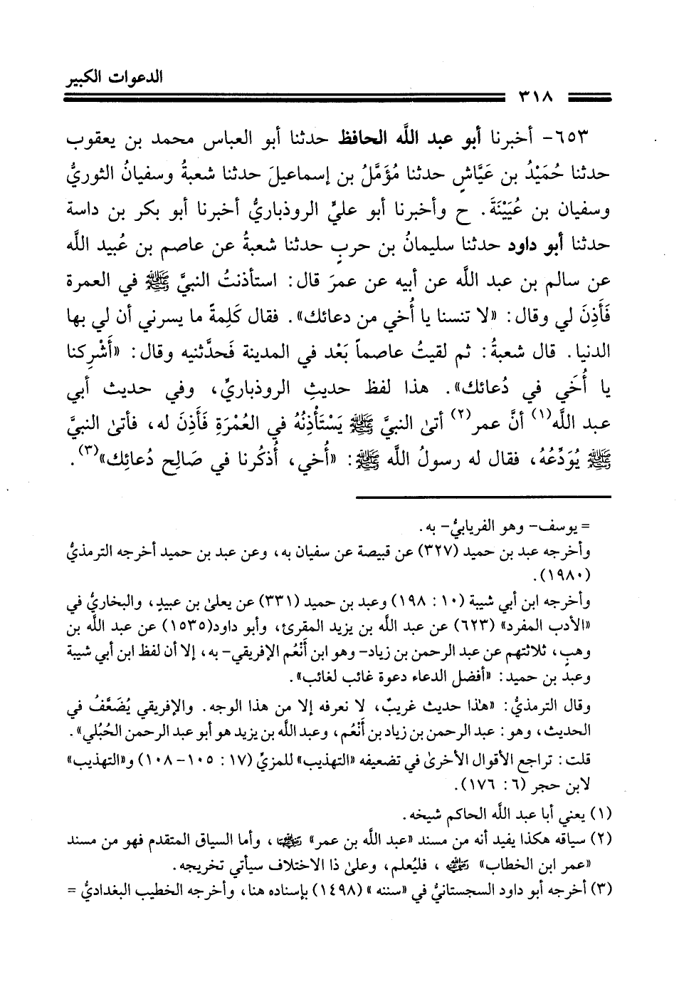 653- أَخْبَرنا أبو عَبْد الله الحافظ حدثنا أبو العباس محمد بن يعقوب حدثنا حميد بن عياش حدثنا مؤمل بن إسماعيل حدثنا شعبة وسفيان الثوري وسفيان بن عيينة ح وأَخْبَرنا أبو علي الزذباري أَخْبَرنا أبو بكر بن داسة حدثنا أبو داود حَدَّثَنا سليمان بن حرب حدثنا شعبة عن عاصم بن عبيد الله عن سالم بن عَبْد الله عن أبيه عن عمر رضي الله عنه , قال استأذنت رسول الله صلى الله عليه وسلم في العمرة فأذن لي وقال لا تنسنا يا أخي من دعائك فقال كلمة ما يسرني أن لي بها الدنيا قال شعبة ثم لقيت عاصما بعد في المدينة فحدثنيه , وقال أشركنا يا أُخي في دعائك.