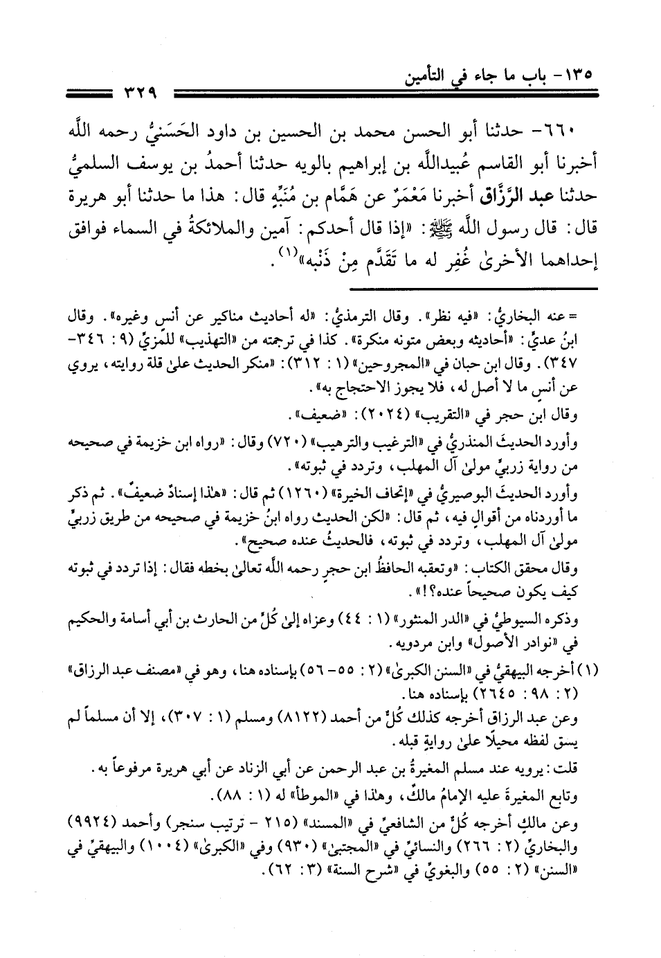 660- حَدَّثَنا أبو الحَسَن محمد بن الحُسَين بن داود الحسني رحمه الله , أَخْبَرنَا أبو القاسم عبيد الله بن إبراهيم بالويه حَدَّثَنا أحمد بن يوسف السلمي حَدَّثَنا عبد الرزاق أَخْبَرنَا معمر عن همام بن منبه قال هذا ما حَدَّثَنا , أبو هريرة رضي الله عنه , قال: قال رسول الله صلى الله عليه وسلم إذا قال أحدكم آمين والملائكة في السَّماء فوافق إحداهما الآخرى غفر له ما تقدم من ذنبه.
