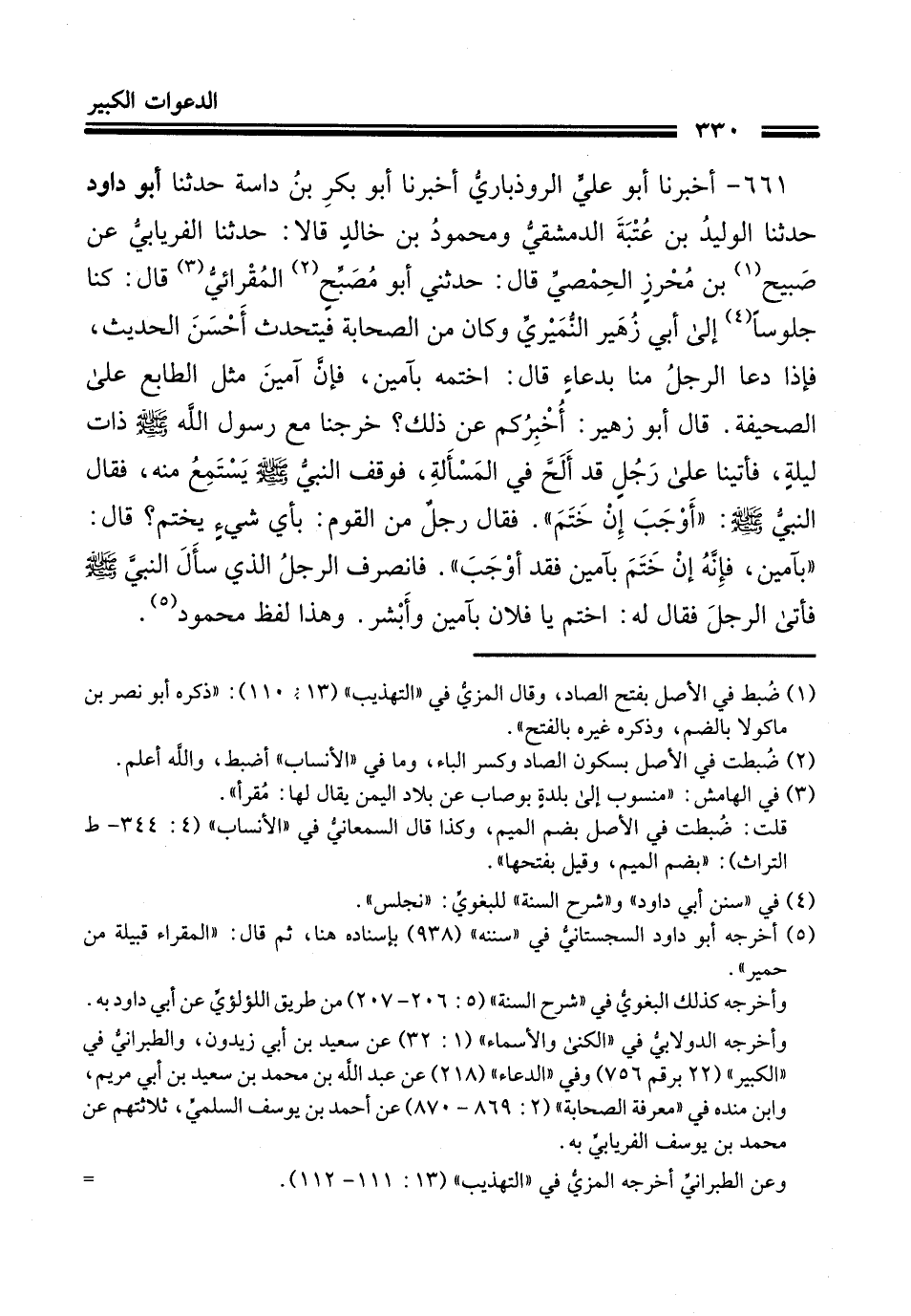 661- أَخْبَرنَا أبو علي الرذاري أَخْبَرنَا أبو بَكْر بن داسة حَدَّثَنا أبو داود حَدَّثَنا الوليد بن عتبة الدمشقي ومحمود بن خالد قالا حَدَّثَنا الفريابي عن صبيح بن محرز الحمصي قال: حدثني أبو مصبح المقرائي قال كنا جلوسا إلى أبي زهير النميري وكان من الصحابة رضي الله عنهم فيتحدث أحسن الحديث , فإذا دعا الرجل منا بدعاء قال اختمه بآمين فإن آمين مثل الطابع على الصحيفة قال أبو رزهيرر أخبركم عن ذلك خرجنا مع رسول الله صلى الله عليه وسلم ذات ليلة فأتينا على رجل قد ألح في المسألة فوقف النبي صلى الله عليه وسلم يستمع منه فقال النبي صلى الله عليه وسلم أوجب إن ختم فقال رحل من القوم بأي شيء يختم قال بآمين فإنه إن ختم بآمين فقد أوجب فانصرف الرجل الذي سأل فأتى الرجل فقال له اختم يا فلان بآمين وأبشر.