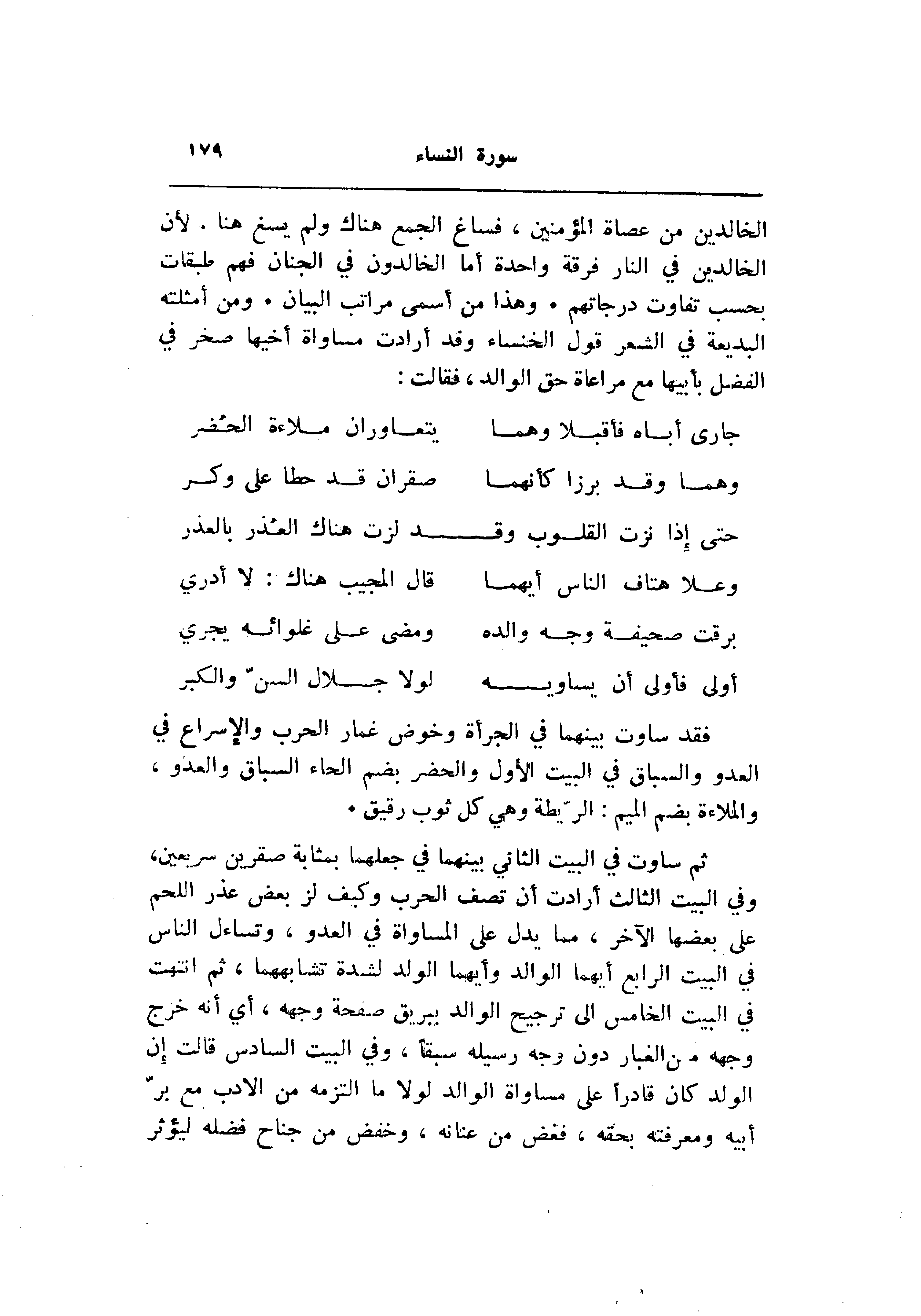 الخالدين من عصاة المؤمنين، فساغ الجمع هناك ولم يسغ هنا. لأن الخالدين في النار فرقة واحدة أما الخالدون في الجنان فهم طبقات بحسب تفاوت درجاتهم. وهذا من أسمى مراتب البيان. ومن أمثلته البديعة في الشعر قول الخنساء وقد أرادت مساواة أخيها صخر في الفضل بأبيها مع مراعاة حق الوالد، فقالت: