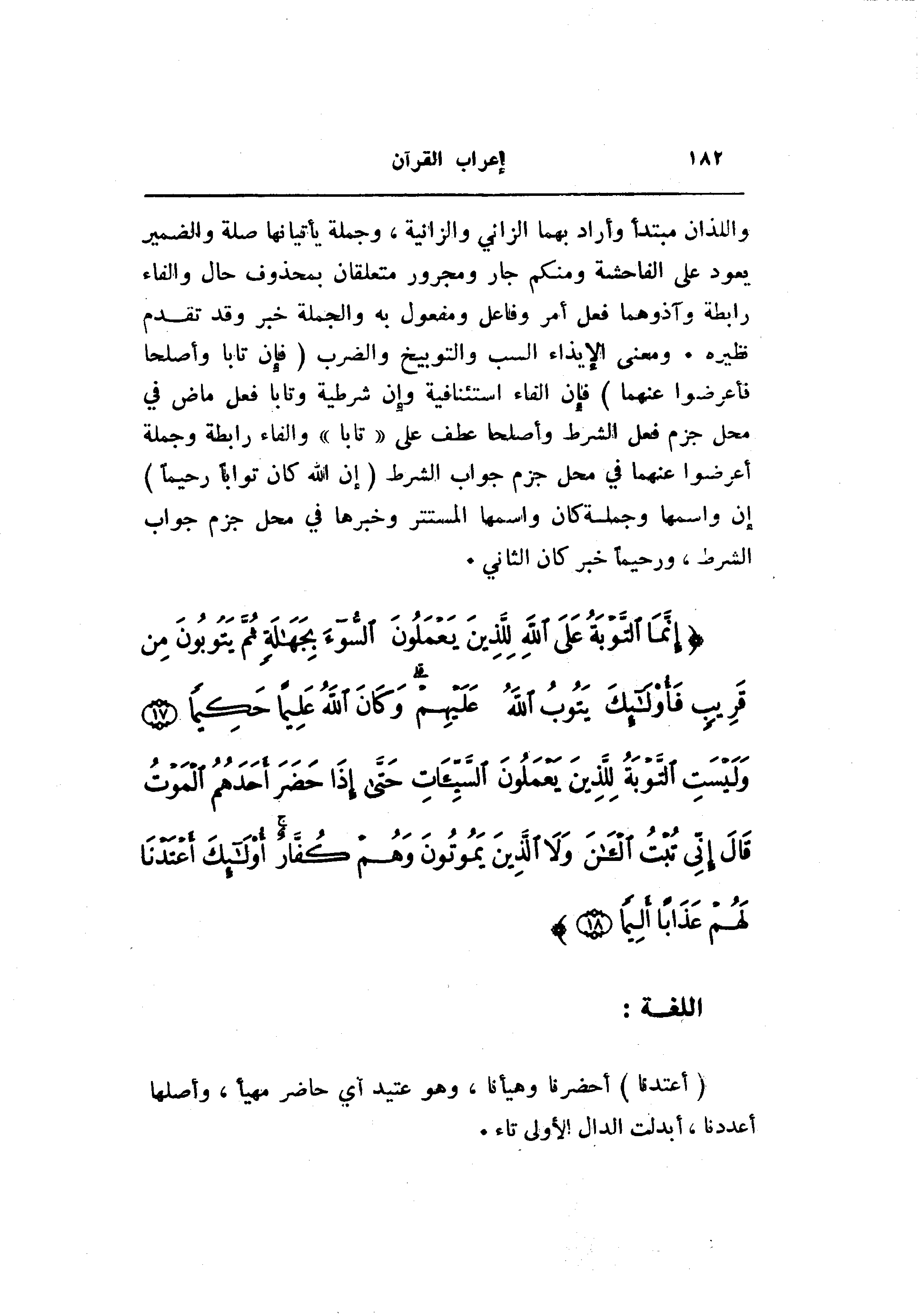واللذان مبتدأ وأراد بهما الزاني والزانية، وجملة يأتيانها صلة والضمير يعود على الفاحشة ومنكم جار ومجرور متعلقان بمحذوف حال والفاء رابطة وآذوهما فعل أمر وفاعل ومفعول به والجملة خبر وقد تقدم نظيره. ومعنى الإيذاء السب والتوبيخ والضرب (فَإِنْ تابا وَأَصْلَحا فَأَعْرِضُوا عَنْهُما) فإن الفاء استئنافية وإن شرطية وتابا فعل ماض في محل جزم فعل الشرط وأصلحا عطف على «تابا» والفاء رابطة وجملة أعرضوا عنهما في محل جزم جواب الشرط (إِنَّ اللَّهَ كانَ تَوَّاباً رَحِيماً) إن واسمها وجملة كان واسمها المستتر وخبرها في محل جزم جواب الشرط، ورحيما خبر كان الثاني.