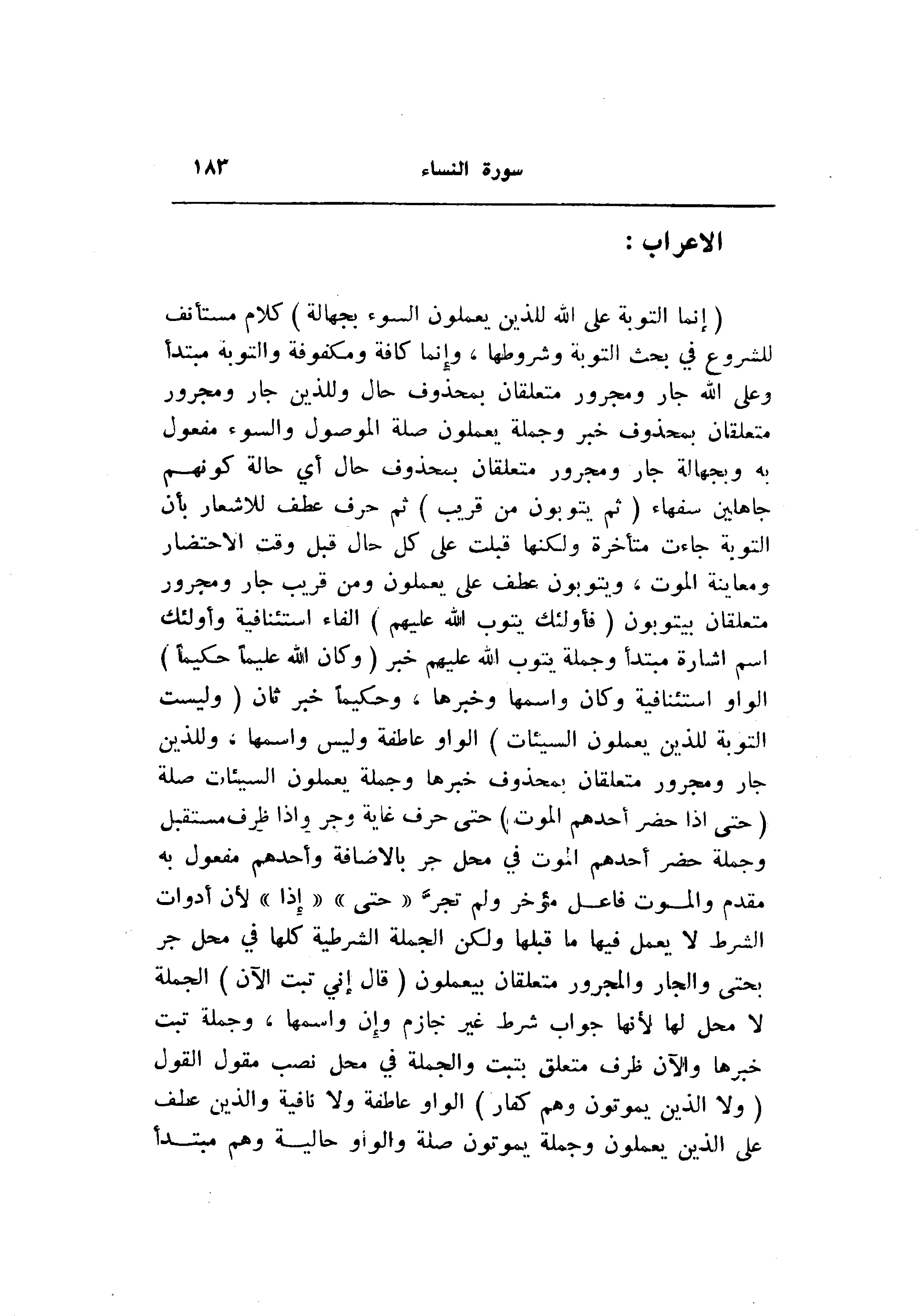 (إِنَّمَا التَّوْبَةُ عَلَى اللَّهِ لِلَّذِينَ يَعْمَلُونَ السُّوءَ بِجَهالَةٍ) كلام مستأنف للشروع في بحث التوبة وشروطها، وإنما كافة ومكفوفة والتوبة مبتدأ وعلى الله جار ومجرور متعلقان بمحذوف حال وللذين جار ومجرور متعلقان بمحذوف خبر وجملة يعملون صلة الموصول والسوء مفعول به وبجهالة جار ومجرور متعلقان بمحذوف حال أي حالة كونهم جاهلين سفهاء (ثُمَّ يَتُوبُونَ مِنْ قَرِيبٍ) ثم حرف عطف للاشعار بأن التوبة جاءت متأخرة ولكنها قبلت على كل حال قبل وقت الاحتضار ومعاينة الموت، ويتوبون عطف على يعملون ومن قريب جار ومجرور متعلقان بيتوبون (فَأُولئِكَ يَتُوبُ اللَّهُ عَلَيْهِمْ) الفاء استئنافية وأولئك اسم اشارة مبتدأ وجملة يتوب الله عليهم خبر (وَكانَ اللَّهُ عَلِيماً حَكِيماً) الواو استئنافية وكان واسمها وخبرها، وحكيما خبر ثان (وَلَيْسَتِ التَّوْبَةُ لِلَّذِينَ يَعْمَلُونَ السَّيِّئاتِ) الواو عاطفة وليس واسمها، وللذين جار ومجرور متعلقان بمحذوف خبرها وجملة يعملون السيئات صلة (حَتَّى إِذا حَضَرَ أَحَدَهُمُ الْمَوْتُ) حتى حرف غاية وجر وإذا ظرف مستقبل وجملة حضر أحدهم الموت في محل جر بالاضافة وأحدهم مفعول به مقدم والموت فاعل مؤخر ولم تجرّ «حتى» «إذا» لأن أدوات الشرط لا يعمل فيها ما قبلها ولكن الجملة الشرطية كلها في محل جر بحتى والجار والمجرور متعلقان بيعملون (قالَ إِنِّي تُبْتُ الْآنَ) الجملة لا محل لها لأنها جواب شرط غير جازم وإن واسمها، وجملة تبت خبرها والآن ظرف متعلق بتبت والجملة في محل نصب مقول القول (وَلَا الَّذِينَ يَمُوتُونَ وَهُمْ كُفَّارٌ) الواو عاطفة ولا نافية والذين عطف على الذين يعملون وجملة يموتون صلة والواو حالية وهم مبتدأ