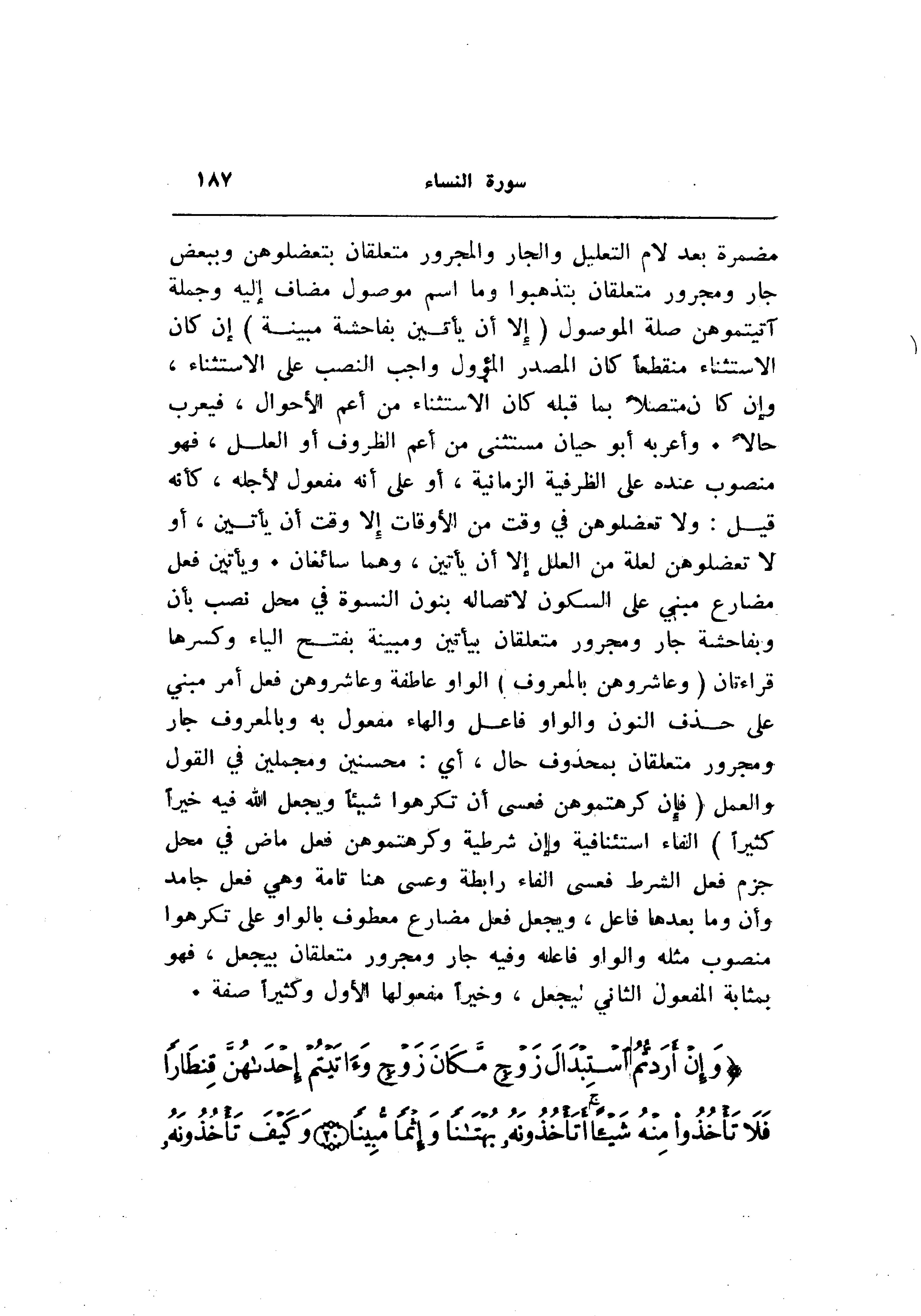 مضمرة بعد لام التعليل والجار والمجرور متعلقان بتعضلوهن وببعض جار ومجرور متعلقان بتذهبوا وما اسم موصول مضاف إليه وجملة آتيتموهن صلة الموصول (إِلَّا أَنْ يَأْتِينَ بِفاحِشَةٍ مُبَيِّنَةٍ) إن كان الاستثناء منقطعا كان المصدر المؤول واجب النصب على الاستثناء، وإن كان متصلا بما قبله كان الاستثناء من أعم الأحوال، فيعرب حالا. وأعربه أبو حيان مستثنى من أعم الظروف أو العلل، فهو منصوب عنده على الظرفية الزمانية، أو على أنه مفعول لأجله، كأنه قيل: ولا تعضلوهن في وقت من الأوقات إلا وقت أن يأتين، أو لا تعضلوهن لعلة من العلل إلا أن يأتين، وهما سائغان. ويأتين فعل مضارع مبني على السكون لاتصاله بنون النسوة في محل نصب بأن وبفاحشة جار ومجرور متعلقان بيأتين ومبينة بفتح الياء وكسرها قراءتان (وَعاشِرُوهُنَّ بِالْمَعْرُوفِ) الواو عاطفة وعاشروهن فعل أمر مبني على حذف النون والواو فاعل والهاء مفعول به وبالمعروف جار ومجرور متعلقان بمحذوف حال، أي: محسنين ومجملين في القول والعمل (فَإِنْ كَرِهْتُمُوهُنَّ فَعَسى أَنْ تَكْرَهُوا شَيْئاً وَيَجْعَلَ اللَّهُ فِيهِ خَيْراً كَثِيراً) الفاء استئنافية وإن شرطية وكرهتموهن فعل ماض في محل جزم فعل الشرط فعسى الفاء رابطة وعسى هنا تامة وهي فعل جامد وأن وما بعدها فاعل، ويجعل فعل مضارع معطوف بالواو على تكرهوا منصوب مثله والواو فاعله وفيه جار ومجرور متعلقان بيجعل، فهو بمثابة المفعول الثاني ليجعل، وخيرا مفعولها الأول وكثيرا صفة.