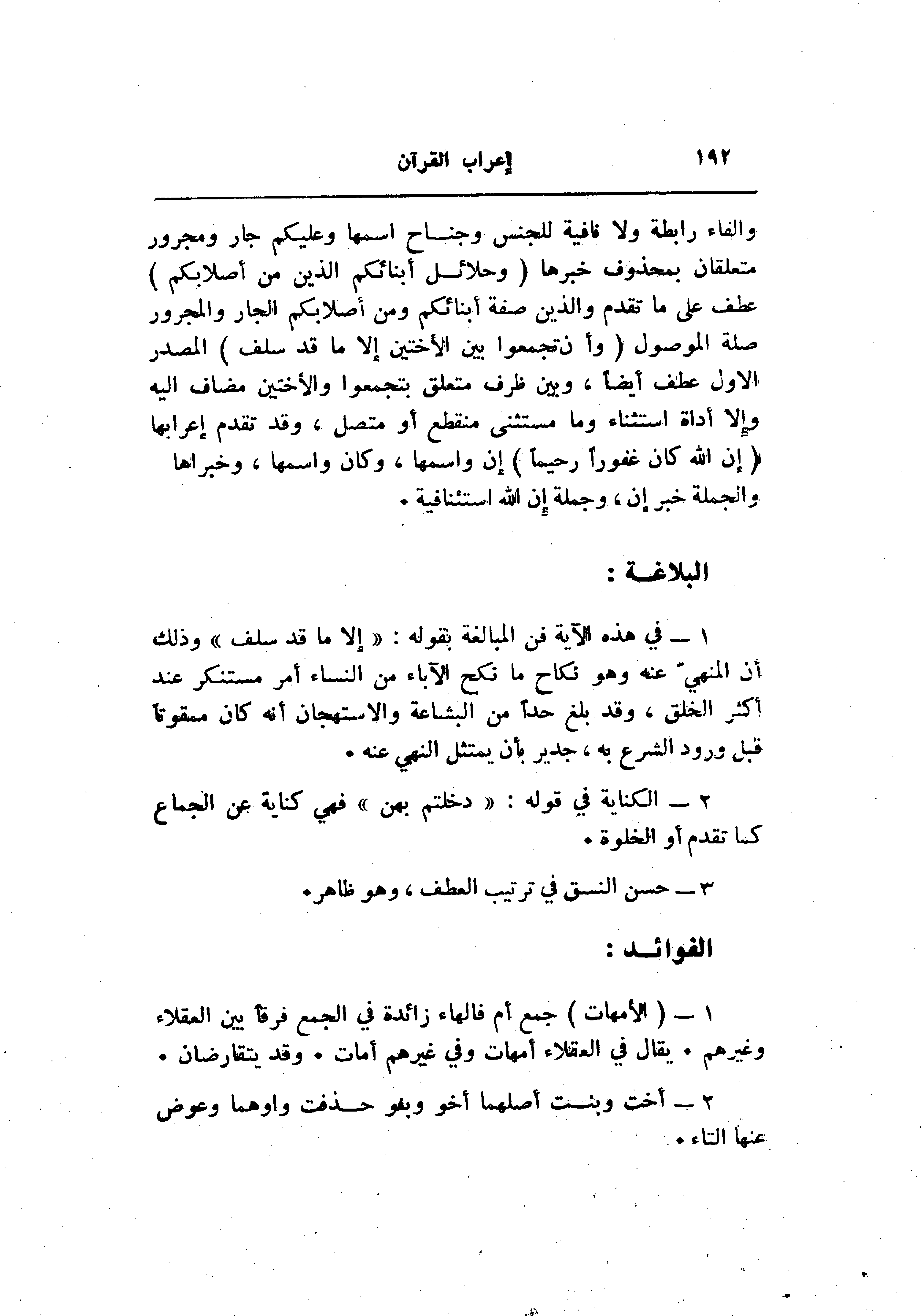 والفاء رابطة ولا نافية للجنس وجناح اسمها وعليكم جار ومجرور متعلقان بمحذوف خبرها (وَحَلائِلُ أَبْنائِكُمُ الَّذِينَ مِنْ أَصْلابِكُمْ) عطف على ما تقدم والذين صفة أبنائكم ومن أصلابكم الجار والمجرور صلة الموصول (وَأَنْ تَجْمَعُوا بَيْنَ الْأُخْتَيْنِ إِلَّا ما قَدْ سَلَفَ) المصدر الاول عطف أيضا، وبين ظرف متعلق بتجمعوا والأختين مضاف اليه وإلا أداة استثناء وما مستثنى منقطع أو متصل، وقد تقدم إعرابها (إِنَّ اللَّهَ كانَ غَفُوراً رَحِيماً) إن واسمها، وكان واسمها، وخبراها والجملة خبر إن، وجملة إن الله استئنافية.