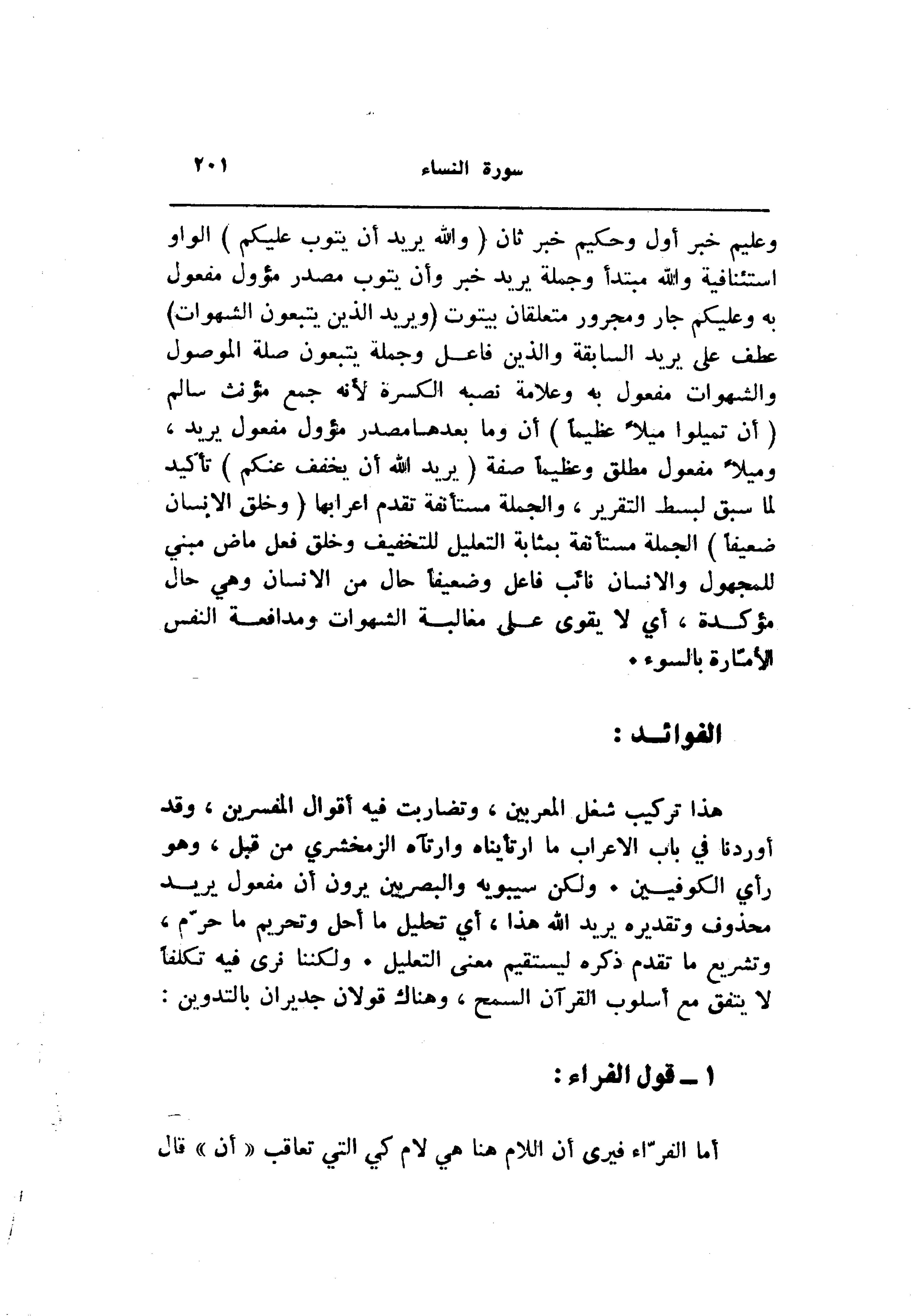 هذا تركيب شغل المعربين، وتضاربت فيه أقوال المفسرين، وقد أوردنا في باب الإعراب ما ارتأيناه وارتآه الزمخشري من قبل، وهو رأي الكوفيين. ولكن سيبويه والبصريين يرون أن مفعول يريد محذوف وتقديره يريد الله هذا، أي تحليل ما أحل وتحريم ما حرّم، وتشريع ما تقدم ذكره ليستقيم معنى التعليل. ولكننا نرى فيه تكلفا لا يتفق مع أسلوب القرآن السمح، وهناك قولان جديران بالتدوين: