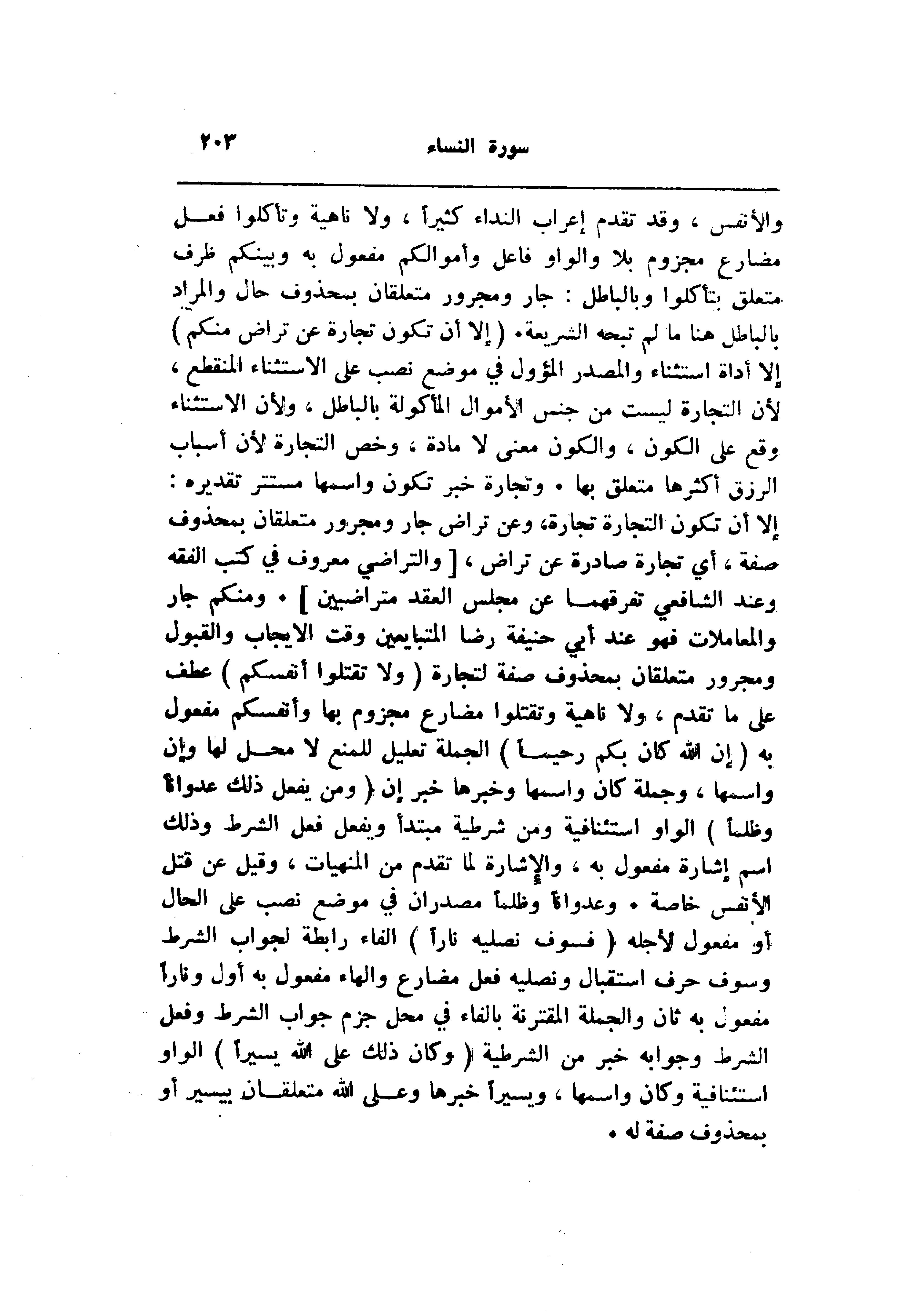 إلا أن تكون التجارة تجارة، وعن تراض جار ومجرور متعلقان بمحذوف صفة، أي تجارة صادرة عن تراض، [والتراضي معروف في كتب الفقه وعند الشافعي تفرقهما عن مجلس العقد متراضيين] . ومنكم جار والمعاملات فهو عند أبي حنيفة رضا المتبايعين وقت الإيجاب والقبول ومجرور متعلقان بمحذوف صفة لتجارة (وَلا تَقْتُلُوا أَنْفُسَكُمْ) عطف على ما تقدم، ولا ناهية وتقتلوا مضارع مجزوم بها وأنفسكم مفعول به (إِنَّ اللَّهَ كانَ بِكُمْ رَحِيماً) الجملة تعليل للمنع لا محل لها وإن واسمها، وجملة كان واسمها وخبرها خبر إن (وَمَنْ يَفْعَلْ ذلِكَ عُدْواناً وَظُلْماً) الواو استئنافية ومن شرطية مبتدأ ويفعل فعل الشرط وذلك اسم إشارة مفعول به، والإشارة لما تقدم من المنهيات، وقيل عن قتل الأنفس خاصة. وعدوانا وظلما مصدران في موضع نصب على الحال أو مفعول لأجله (فَسَوْفَ نُصْلِيهِ ناراً) الفاء رابطة لجواب الشرط وسوف حرف استقبال ونصليه فعل مضارع والهاء مفعول به أول ونارا مفعول به ثان والجملة المقترنة بالفاء في محل جزم جواب الشرط وفعل الشرط وجوابه خبر من الشرطية (وَكانَ ذلِكَ عَلَى اللَّهِ يَسِيراً) الواو استئنافية وكان واسمها، ويسيرا خبرها وعلى الله متعلقان بيسير أو بمحذوف صفة له.