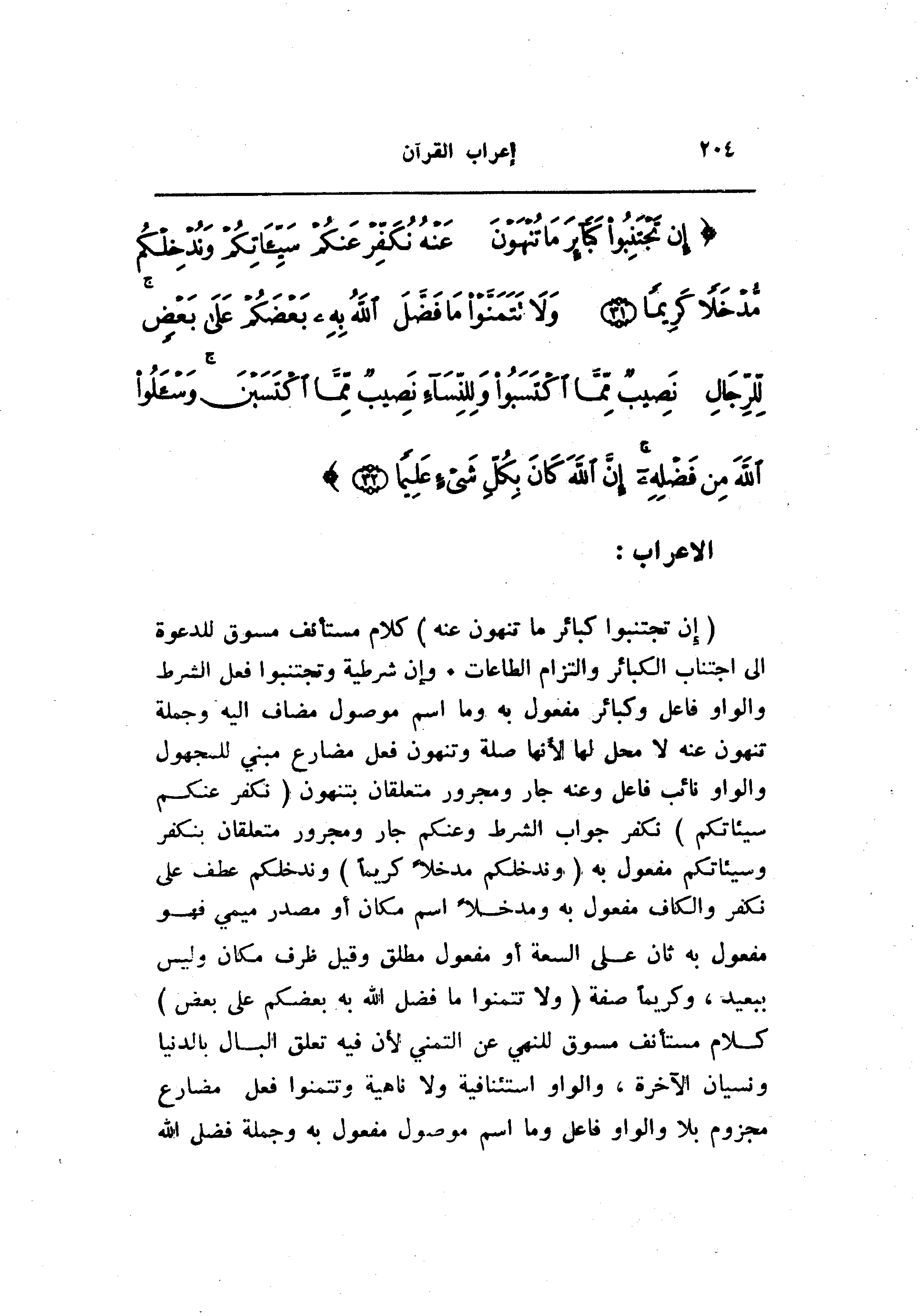 (إِنْ تَجْتَنِبُوا كَبائِرَ ما تُنْهَوْنَ عَنْهُ) كلام مستأنف مسوق للدعوة الى اجتناب الكبائر والتزام الطاعات. وإن شرطية وتجتنبوا فعل الشرط والواو فاعل وكبائر مفعول به وما اسم موصول مضاف اليه وجملة تنهون عنه لا محل لها لأنها صلة وتنهون فعل مضارع مبني للمجهول والواو نائب فاعل وعنه جار ومجرور متعلقان بتنهون (نُكَفِّرْ عَنْكُمْ سَيِّئاتِكُمْ) نكفر جواب الشرط وعنكم جار ومجرور متعلقان بنكفر وسيئاتكم مفعول به (وَنُدْخِلْكُمْ مُدْخَلًا كَرِيماً) وندخلكم عطف على نكفر والكاف مفعول به ومدخلا اسم مكان أو مصدر ميمي فهو مفعول به ثان على السعة أو مفعول مطلق وقيل ظرف مكان وليس ببعيد، وكريما صفة (وَلا تَتَمَنَّوْا ما فَضَّلَ اللَّهُ بِهِ بَعْضَكُمْ عَلى بَعْضٍ) كلام مستأنف مسوق للنهي عن التمني لأن فيه تعلق البال بالدنيا ونسيان الآخرة، والواو استئنافية ولا ناهية وتتمنوا فعل مضارع مجزوم بلا والواو فاعل وما اسم موصول مفعول به وجملة فضل الله