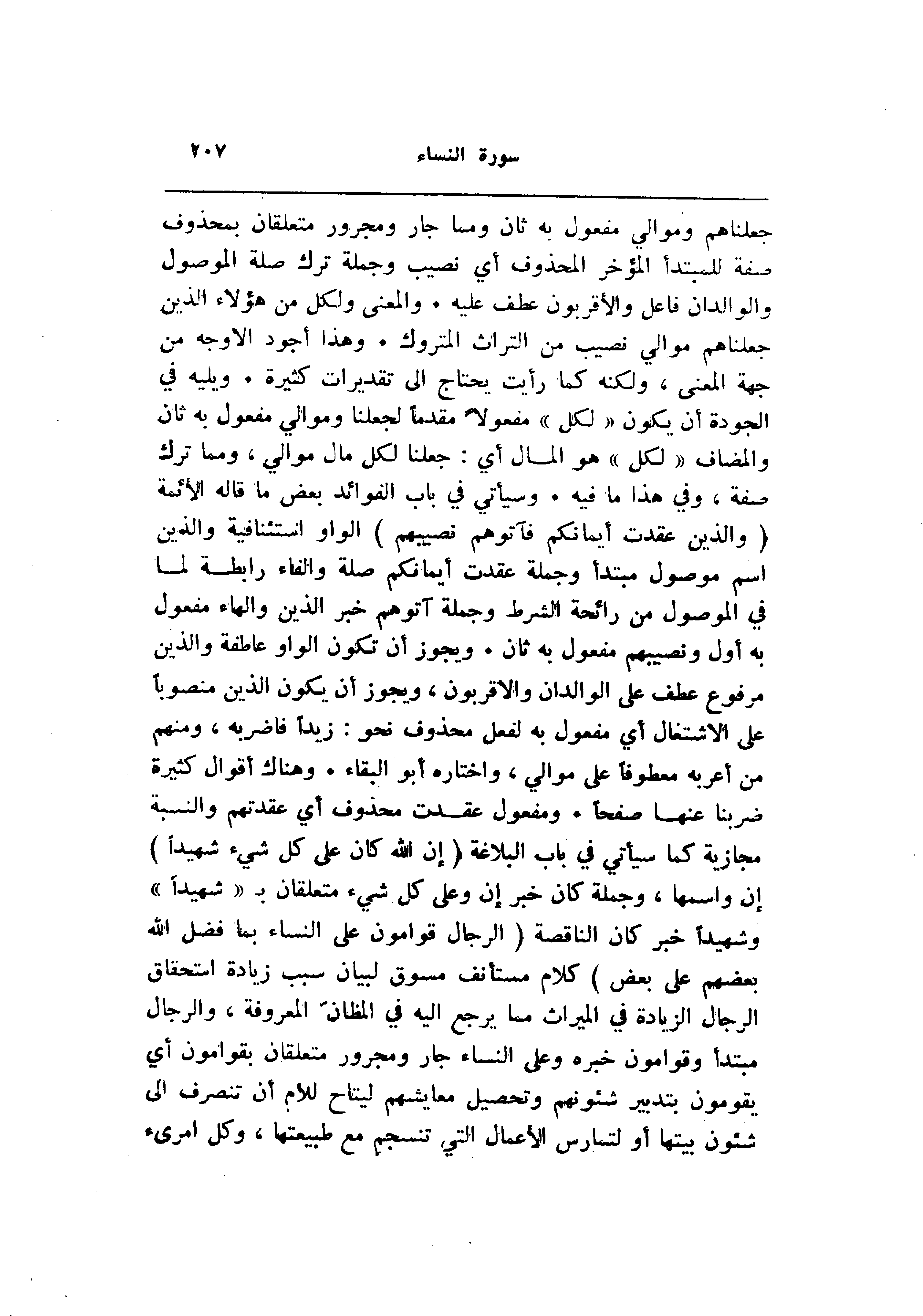 جعلناهم وموالي مفعول به ثان ومما جار ومجرور متعلقان بمحذوف صفة للمبتدأ المؤخر المحذوف أي نصيب وجملة ترك صلة الموصول والوالدان فاعل والأقربون عطف عليه. والمعنى ولكل من هؤلاء الذين جعلناهم موالي نصيب من التراث المتروك. وهذا أجود الاوجه من جهة المعنى، ولكنه كما رأيت يحتاج الى تقديرات كثيرة. ويليه في الجودة أن يكون «لكل» مفعولا مقدما لجعلنا وموالي مفعول به ثان والمضاف «لكل» هو المال أي: جعلنا لكل مال موالي، ومما ترك صفة، وفي هذا ما فيه. وسيأتي في باب الفوائد بعض ما قاله الأئمة (وَالَّذِينَ عَقَدَتْ أَيْمانُكُمْ فَآتُوهُمْ نَصِيبَهُمْ) الواو استئنافية والذين اسم موصول مبتدأ وجملة عقدت أيمانكم صلة والفاء رابطة لما في الموصول من رائحة الشرط وجملة آتوهم خبر الذين والهاء مفعول به أول ونصيبهم مفعول به ثان. ويجوز أن تكون الواو عاطفة والذين مرفوع عطف على الوالدان والأقربون، ويجوز أن يكون الذين منصوبا على الاشتغال أي مفعول به لفعل محذوف نحو: زيدا فاضربه، ومنهم من أعربه معطوفا على موالي، واختاره أبو البقاء. وهناك أقوال كثيرة ضربنا عنها صفحا. ومفعول عقدت محذوف أي عقدتهم والنسبة مجازية كما سيأتي في باب البلاغة (إِنَّ اللَّهَ كانَ عَلى كُلِّ شَيْءٍ شَهِيداً) إن واسمها، وجملة كان خبر إن وعلى كل شيء متعلقان ب «شهيدا» وشهيدا خبر كان الناقصة (الرِّجالُ قَوَّامُونَ عَلَى النِّساءِ بِما فَضَّلَ اللَّهُ بَعْضَهُمْ عَلى بَعْضٍ) كلام مستأنف مسوق لبيان سبب زيادة استحقاق الرجال الزيادة في الميراث مما يرجع اليه في المظانّ المعروفة، والرجال مبتدأ وقوامون خبره وعلى النساء جار ومجرور متعلقان بقوامون أي يقومون بتدبير شئونهم وتحصيل معايشهم ليتاح للأم أن تنصرف الى شئون بيتها أو لتمارس الأعمال التي تنسجم مع طبيعتها، وكل امرئ