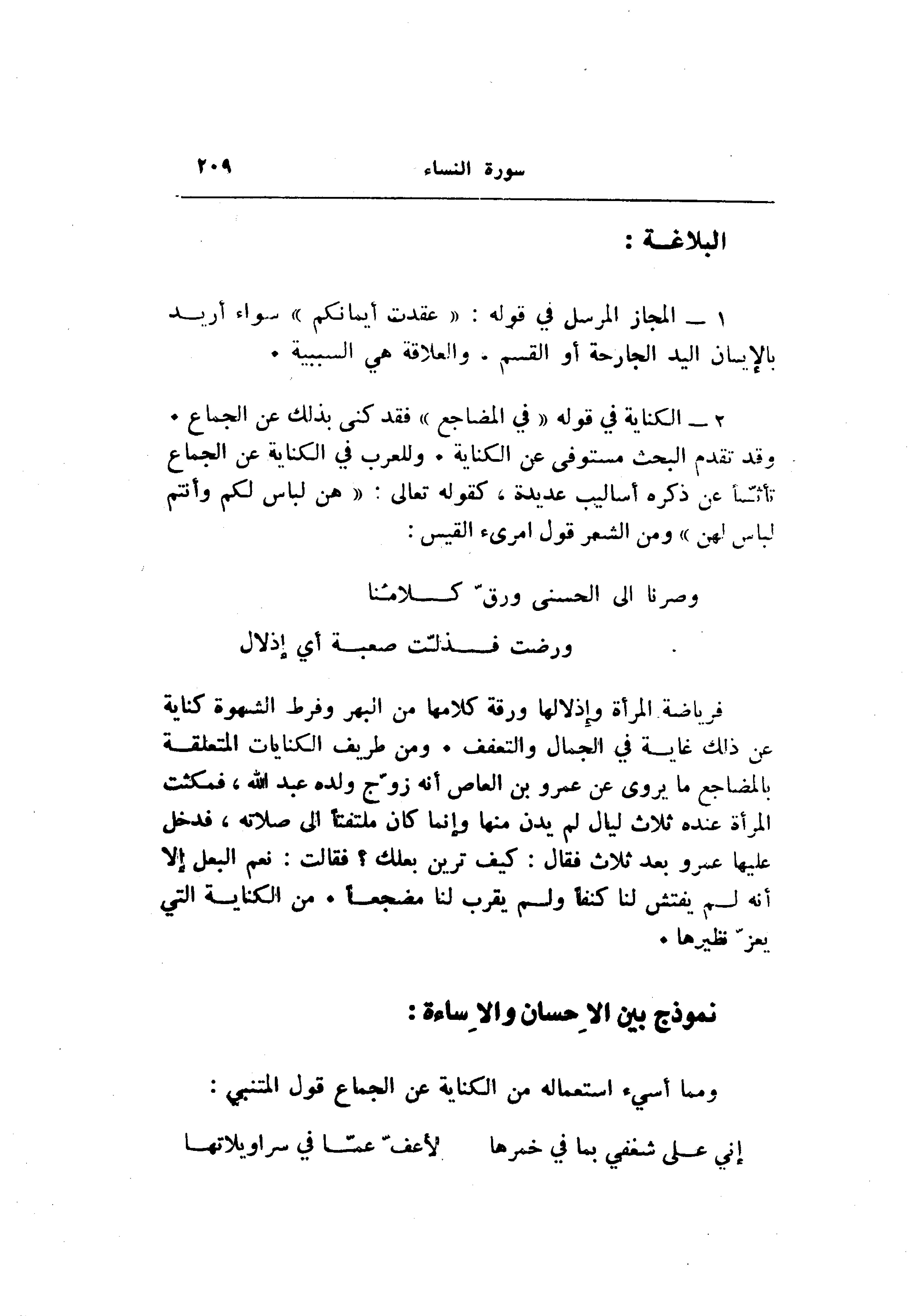 وقد تقدم البحث مستوفى عن الكناية. وللعرب في الكناية عن الجماع تأثّما عن ذكره أساليب عديدة، كقوله تعالى: «هن لباس لكم وأنتم لباس لهن» ومن الشعر قول امرئ القيس: