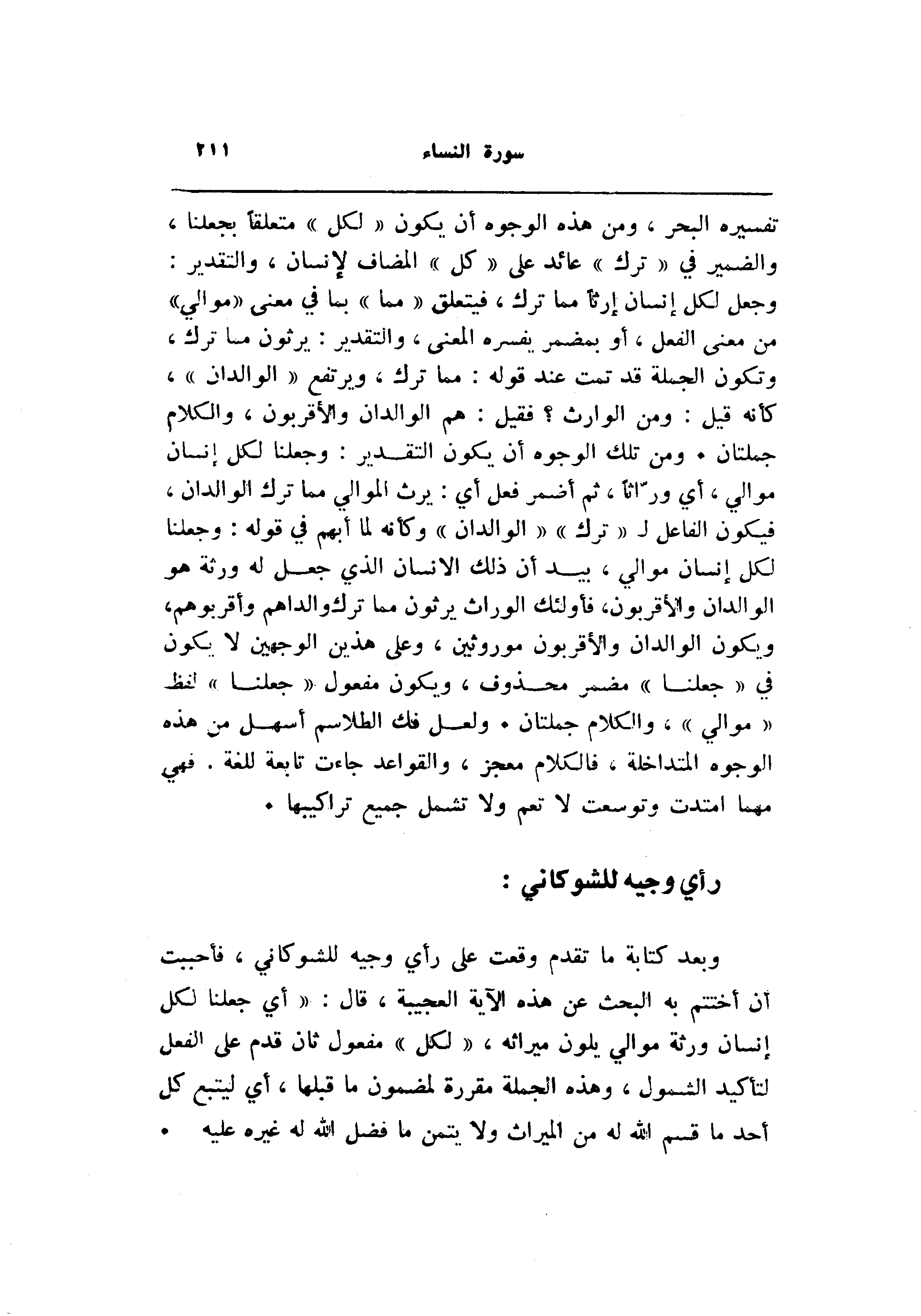 وبعد كتابة ما تقدم وقعت على رأي وجيه للشوكاني، فأحببت أن أختتم به البحث عن هذه الآية العجيبة، قال: «أي جعلنا لكل إنسان ورثة موالي يلون ميراثه، «لكل» مفعول ثان قدم على الفعل لتأكيد الشمول، وهذه الجملة مقررة لمضمون ما قبلها، أي ليتبع كل أحد ما قسم الله له من الميراث ولا يتمن ما فضل الله له غيره عليه.