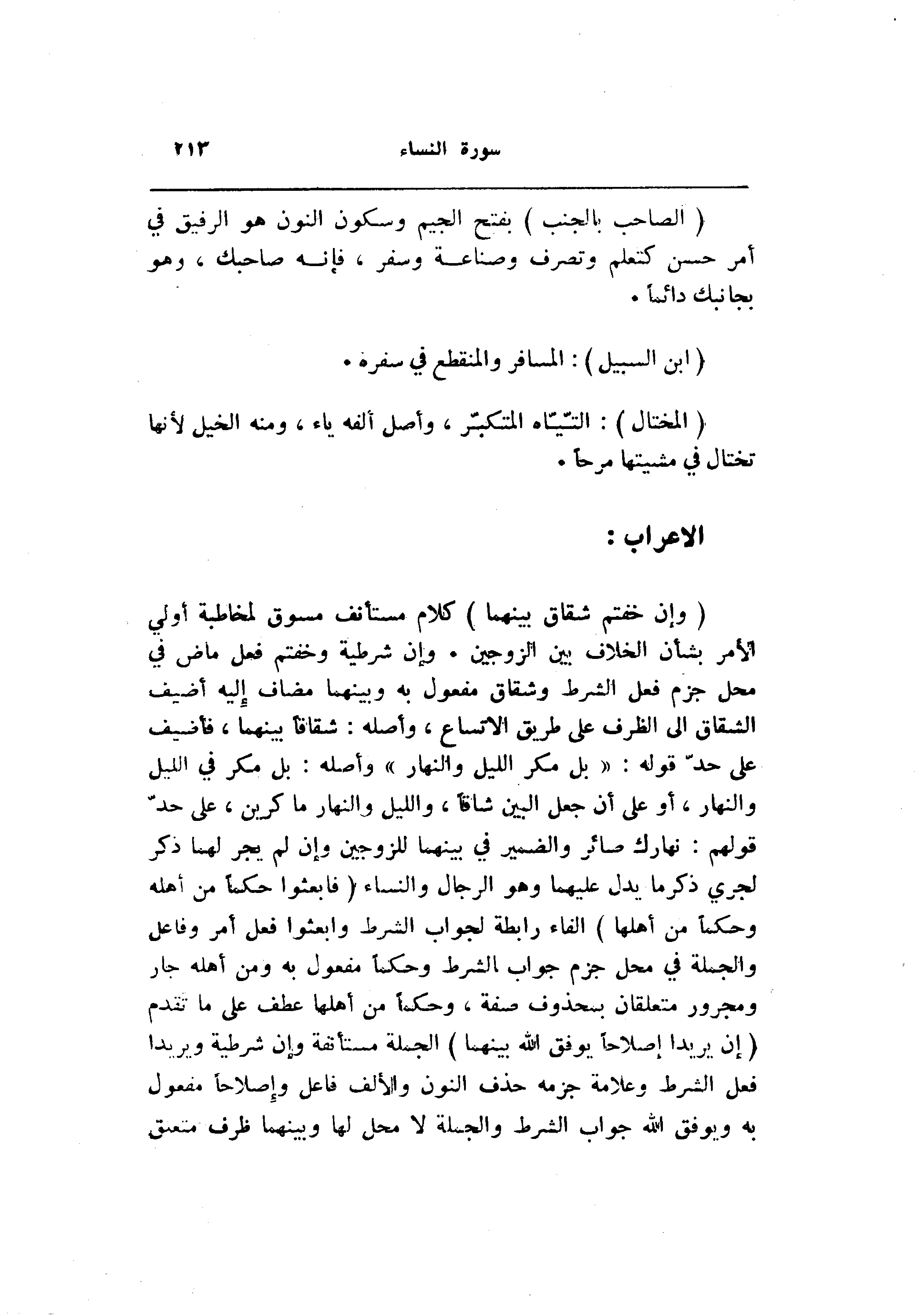 (وَإِنْ خِفْتُمْ شِقاقَ بَيْنِهِما) كلام مستأنف مسوق لمخاطبة أولي الأمر بشأن الخلاف بين الزوجين. وإن شرطية وخفتم فعل ماض في محل جزم فعل الشرط وشقاق مفعول به وبينهما مضاف إليه أضيف الشقاق الى الظرف على طريق الاتساع، وأصله: شقاقا بينهما، فأضيف على حدّ قوله: «بل مكر الليل والنهار» وأصله: بل مكر في الليل والنهار، أو على أن جعل البين شاقا، والليل والنهار ما كرين، على حدّ قولهم: نهارك صائر والضمير في بينهما للزوجين وإن لم يجر لهما ذكر لجري ذكر ما يدل عليهما وهو الرجال والنساء (فَابْعَثُوا حَكَماً مِنْ أَهْلِهِ وَحَكَماً مِنْ أَهْلِها) الفاء رابطة لجواب الشرط وابعثوا فعل أمر وفاعل والجملة في محل جزم جواب الشرط وحكما مفعول به ومن أهله جار ومجرور متعلقان بمحذوف صفة، وحكما من أهلها عطف على ما تقدم (إِنْ يُرِيدا إِصْلاحاً يُوَفِّقِ اللَّهُ بَيْنَهُما) الجملة مستأنفة وإن شرطية ويريدا فعل الشرط وعلامة جزمه حذف النون والألف فاعل وإصلاحا مفعول به ويوفق الله جواب الشرط والجملة لا محل لها وبينهما ظرف متعلق