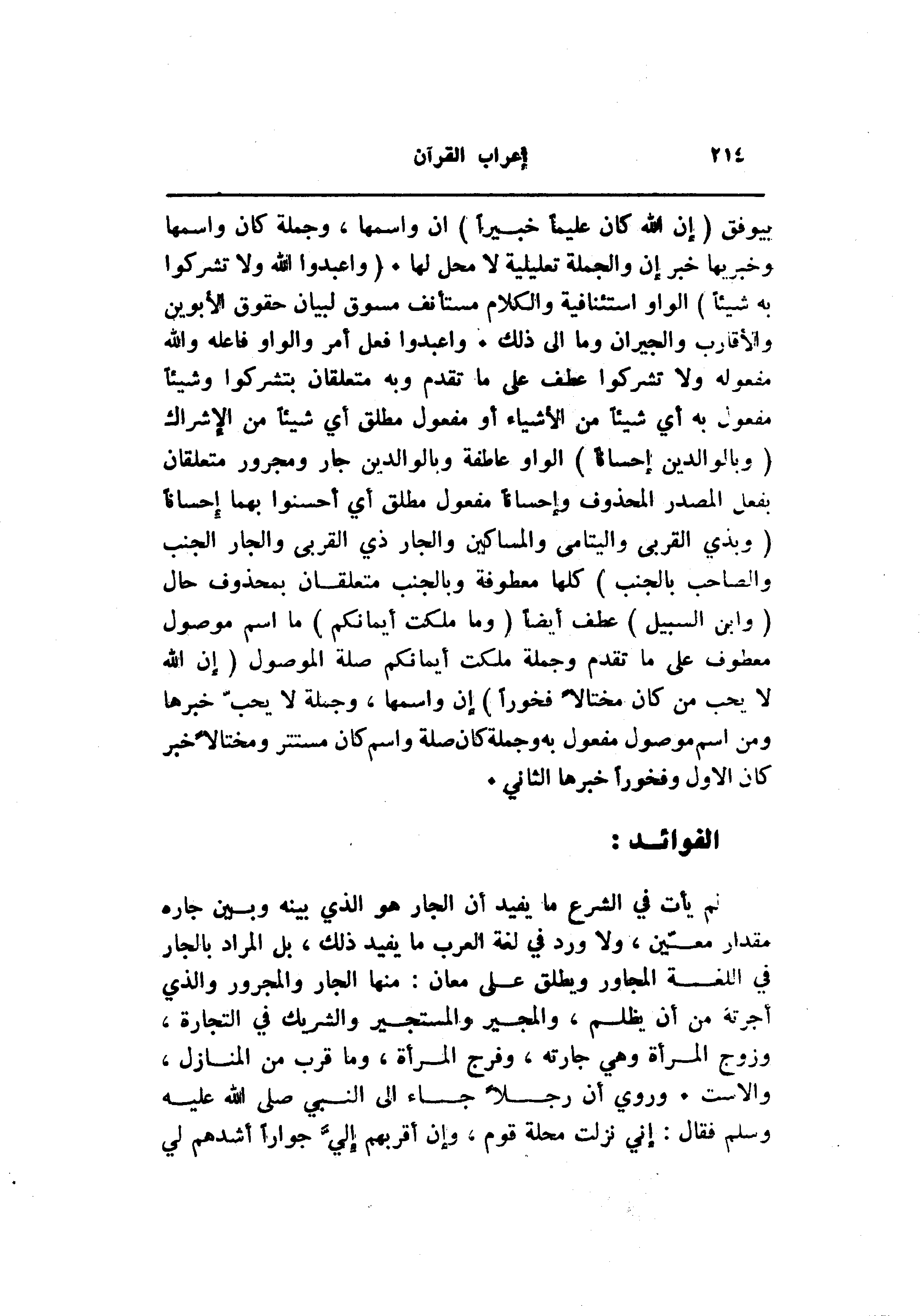 بيوفق (إِنَّ اللَّهَ كانَ عَلِيماً خَبِيراً) ان واسمها، وجملة كان واسمها وخبريها خبر إن والجملة تعليلية لا محل لها. (وَاعْبُدُوا اللَّهَ وَلا تُشْرِكُوا بِهِ شَيْئاً) الواو استئنافية والكلام مستأنف مسوق لبيان حقوق الأبوين والأقارب والجيران وما الى ذلك. واعبدوا فعل أمر والواو فاعله والله مفعوله ولا تشركوا عطف على ما تقدم وبه متعلقان بتشركوا وشيئا مفعول به أي شيئا من الأشياء أو مفعول مطلق أي شيئا من الإشراك (وَبِالْوالِدَيْنِ إِحْساناً) الواو عاطفة وبالوالدين جار ومجرور متعلقان بفعل المصدر المحذوف وإحسانا مفعول مطلق أي أحسنوا بهما إحسانا (وَبِذِي الْقُرْبى وَالْيَتامى وَالْمَساكِينِ وَالْجارِ ذِي الْقُرْبى وَالْجارِ الْجُنُبِ وَالصَّاحِبِ بِالْجَنْبِ) كلها معطوفة وبالجنب متعلقان بمحذوف حال (وَابْنِ السَّبِيلِ) عطف أيضا (وَما مَلَكَتْ أَيْمانُكُمْ) ما اسم موصول معطوف على ما تقدم وجملة ملكت أيمانكم صلة الموصول (إِنَّ اللَّهَ لا يُحِبُّ مَنْ كانَ مُخْتالًا فَخُوراً) إن واسمها، وجملة لا يحبّ خبرها ومن اسم موصول مفعول به وجملة كان صلة واسم كان مستتر ومختالا خبر كان الاول وفخورا خبرها الثاني.