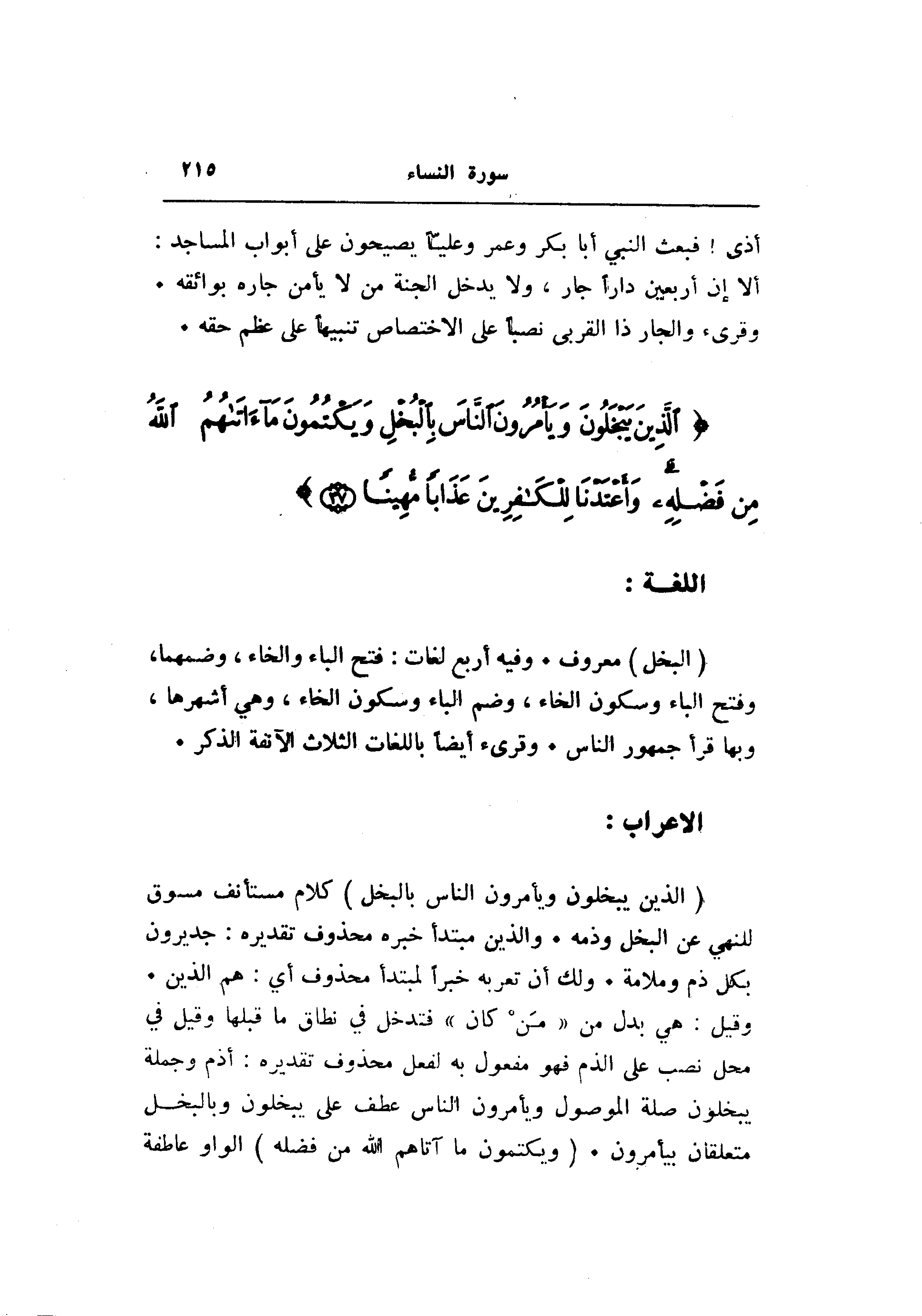 وقيل: هي بدل من «من كان» فتدخل في نطاق ما قبلها وقيل في محل نصب على الذم فهو مفعول به لفعل محذوف تقديره: أذم وجملة يبخلون صلة الموصول ويأمرون الناس عطف على يبخلون وبالبخل متعلقان بيأمرون. (وَيَكْتُمُونَ ما آتاهُمُ اللَّهُ مِنْ فَضْلِهِ) الواو عاطفة