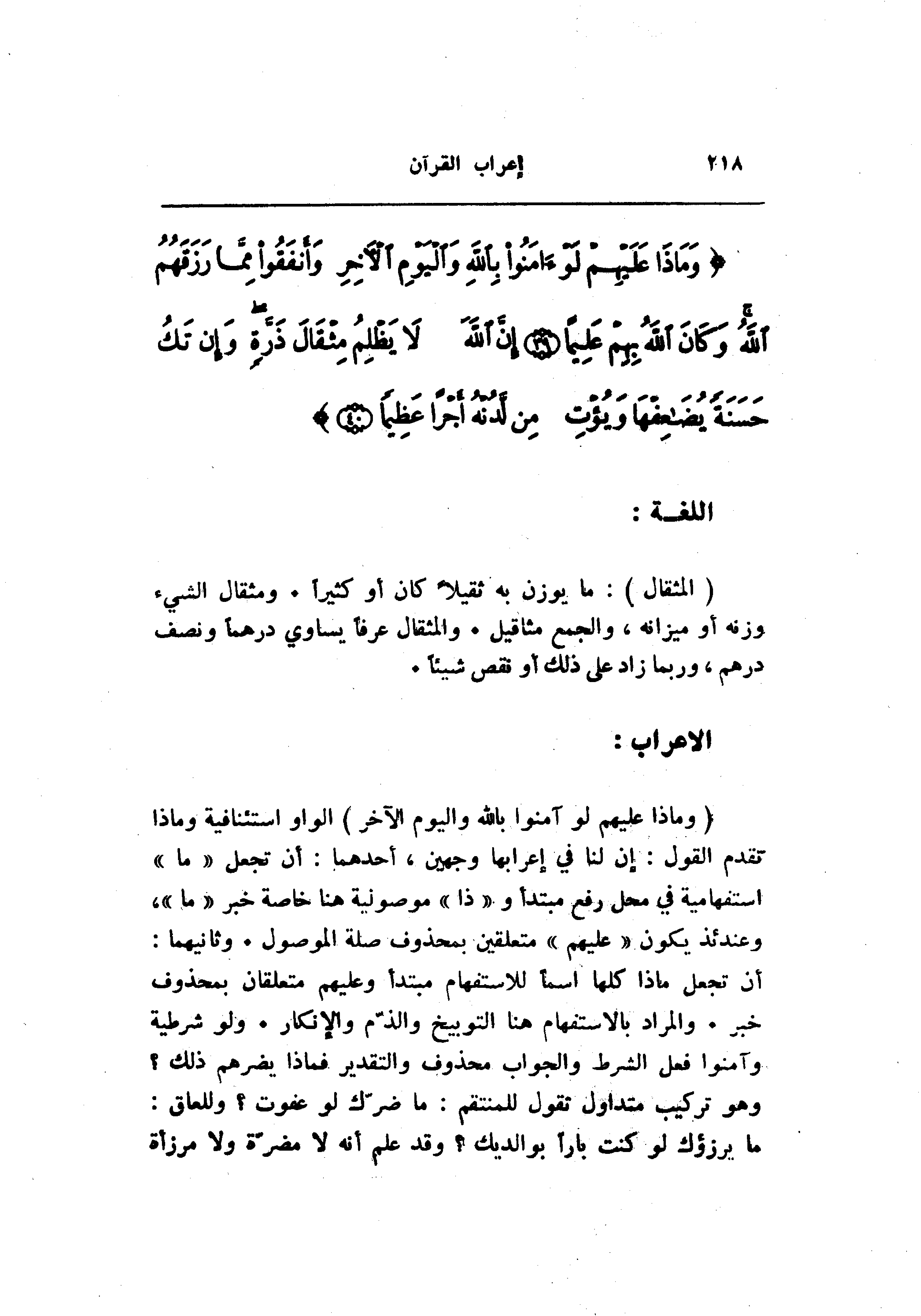 (وَماذا عَلَيْهِمْ لَوْ آمَنُوا بِاللَّهِ وَالْيَوْمِ الْآخِرِ) الواو استئنافية وماذا تقدم القول: إن لنا في إعرابها وجهين، أحدهما: أن تجعل «ما» استفهامية في محل رفع مبتدأ و «ذا» موصولية هنا خاصة خبر «ما» ، وعندئذ يكون «عليهم» متعلقين بمحذوف صلة الموصول. وثانيهما: