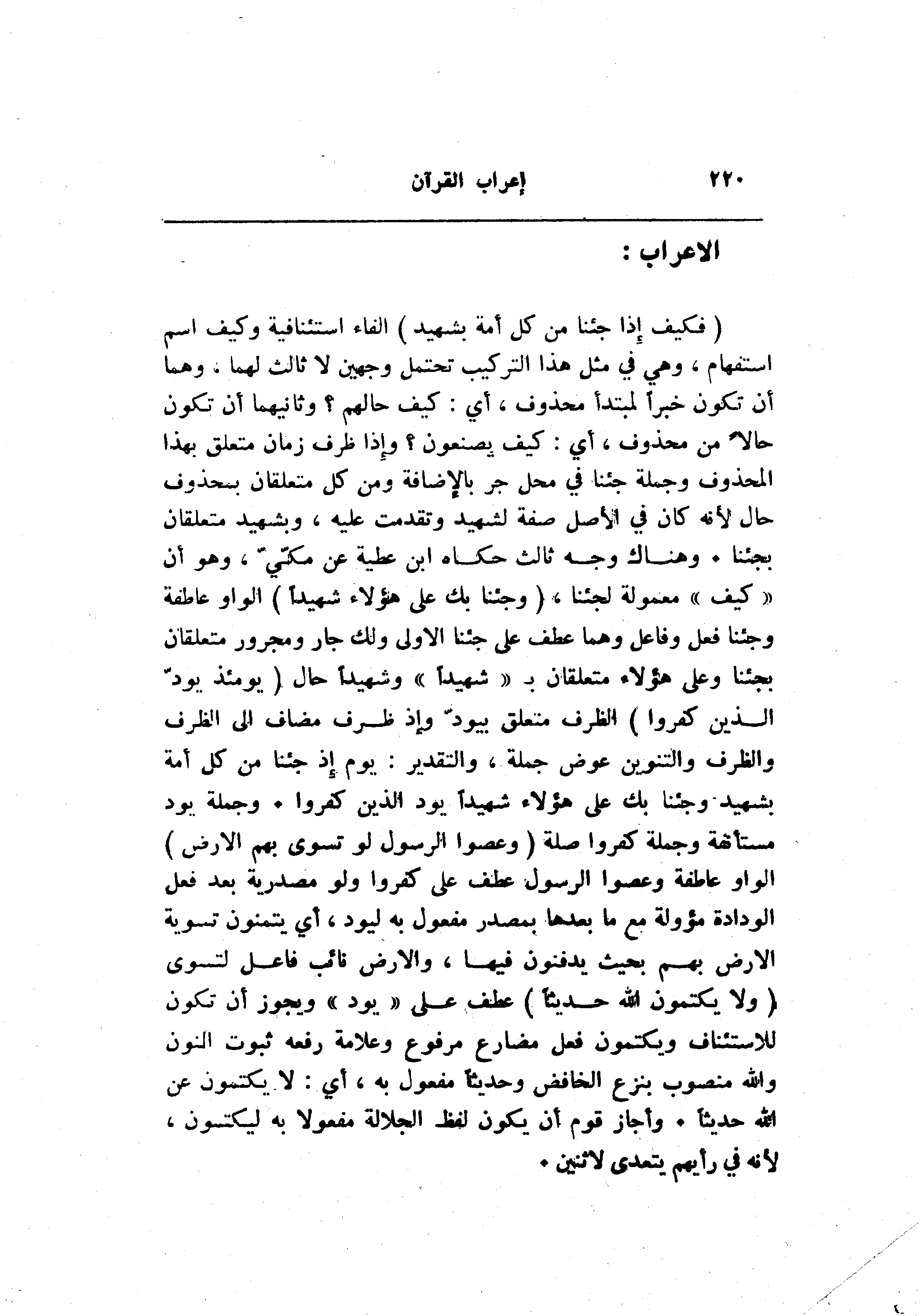(فَكَيْفَ إِذا جِئْنا مِنْ كُلِّ أُمَّةٍ بِشَهِيدٍ) الفاء استئنافية وكيف اسم استفهام، وهي في مثل هذا التركيب تحتمل وجهين لا ثالث لهما، وهما أن تكون خبرا لمبتدأ محذوف، أي: كيف حالهم؟ وثانيهما أن تكون حالا من محذوف، أي: كيف يصنعون؟ وإذا ظرف زمان متعلق بهذا المحذوف وجملة جئنا في محل جر بالإضافة ومن كل متعلقان بمحذوف حال لأنه كان في الأصل صفة لشهيد وتقدمت عليه، وبشهيد متعلقان بجئنا. وهناك وجه ثالث حكاه ابن عطية عن مكّيّ، وهو أن «كيف» معمولة لجئنا، (وَجِئْنا بِكَ عَلى هؤُلاءِ شَهِيداً) الواو عاطفة وجئنا فعل وفاعل وهما عطف على جئنا الاولى ولك جار ومجرور متعلقان بجئنا وعلى هؤلاء متعلقان ب «شهيدا» وشهيدا حال (يَوْمَئِذٍ يَوَدُّ الَّذِينَ كَفَرُوا) الظرف متعلق بيودّ وإذ ظرف مضاف الى الظرف والظرف والتنوين عوض جملة، والتقدير: يوم إذ جئنا من كل أمة بشهيد وجئنا بك على هؤلاء شهيدا يود الذين كفروا. وجملة يود مستأنفة وجملة كفروا صلة (وَعَصَوُا الرَّسُولَ لَوْ تُسَوَّى بِهِمُ الْأَرْضُ) الواو عاطفة وعصوا الرسول عطف على كفروا ولو مصدرية بعد فعل الودادة مؤولة مع ما بعدها بمصدر مفعول به ليود، أي يتمنون تسوية الأرض بهم بحيث يدفنون فيها، والأرض نائب فاعل لتسوى (وَلا يَكْتُمُونَ اللَّهَ حَدِيثاً) عطف على «يود» ويجوز أن تكون للاستئناف ويكتمون فعل مضارع مرفوع وعلامة رفعه ثبوت النون والله منصوب بنزع الخافض وحديثا مفعول به، أي: لا يكتمون عن الله حديثا. وأجاز قوم أن يكون لفظ الجلالة مفعولا به ليكتمون، لأنه في رأيهم يتعدى لاثنين.