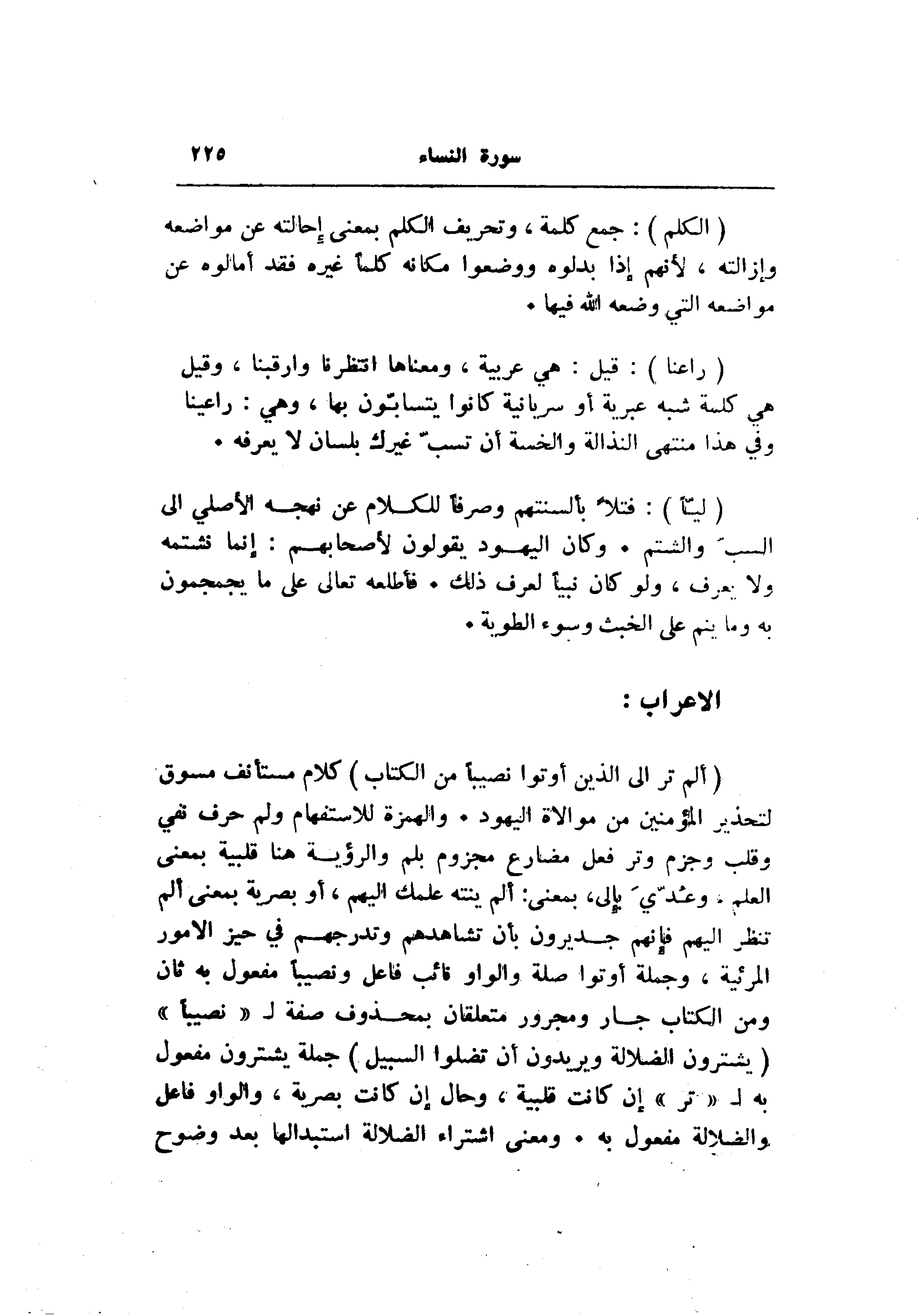 (أَلَمْ تَرَ إِلَى الَّذِينَ أُوتُوا نَصِيباً مِنَ الْكِتابِ) كلام مستأنف مسوق لتحذير المؤمنين من موالاة اليهود. والهمزة للاستفهام ولم حرف نفي وقلب وجزم وتر فعل مضارع مجزوم بلم والرؤية هنا قلبية بمعنى العلم. وعدّي بإلى، بمعنى: ألم ينته علمك إليهم، أو بصرية بمعنى ألم تنظر إليهم فإنهم جديرون بأن تشاهدهم وتدرجهم في حيز الأمور المرئية، وجملة أوتوا صلة والواو نائب فاعل ونصيبا مفعول به ثان ومن الكتاب جار ومجرور متعلقان بمحذوف صفة ل «نصيبا» (يَشْتَرُونَ الضَّلالَةَ وَيُرِيدُونَ أَنْ تَضِلُّوا السَّبِيلَ) جملة يشترون مفعول به ل «تر» إن كانت قلبية، وحال إن كانت بصرية، والواو فاعل والضلالة مفعول به. ومعنى اشتراء الضلالة استبدالها بعد وضوح